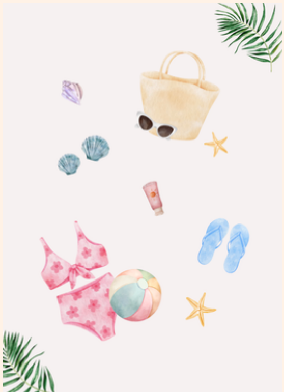 Celebrate the sunny season with this colorful Summer Day greeting card, featuring all your favorite summer essentials—bikinis, palm leaves, beach balls, flip flops, shells, and sunglasses. It’s a cheerful way to share good vibes and warm wishes.