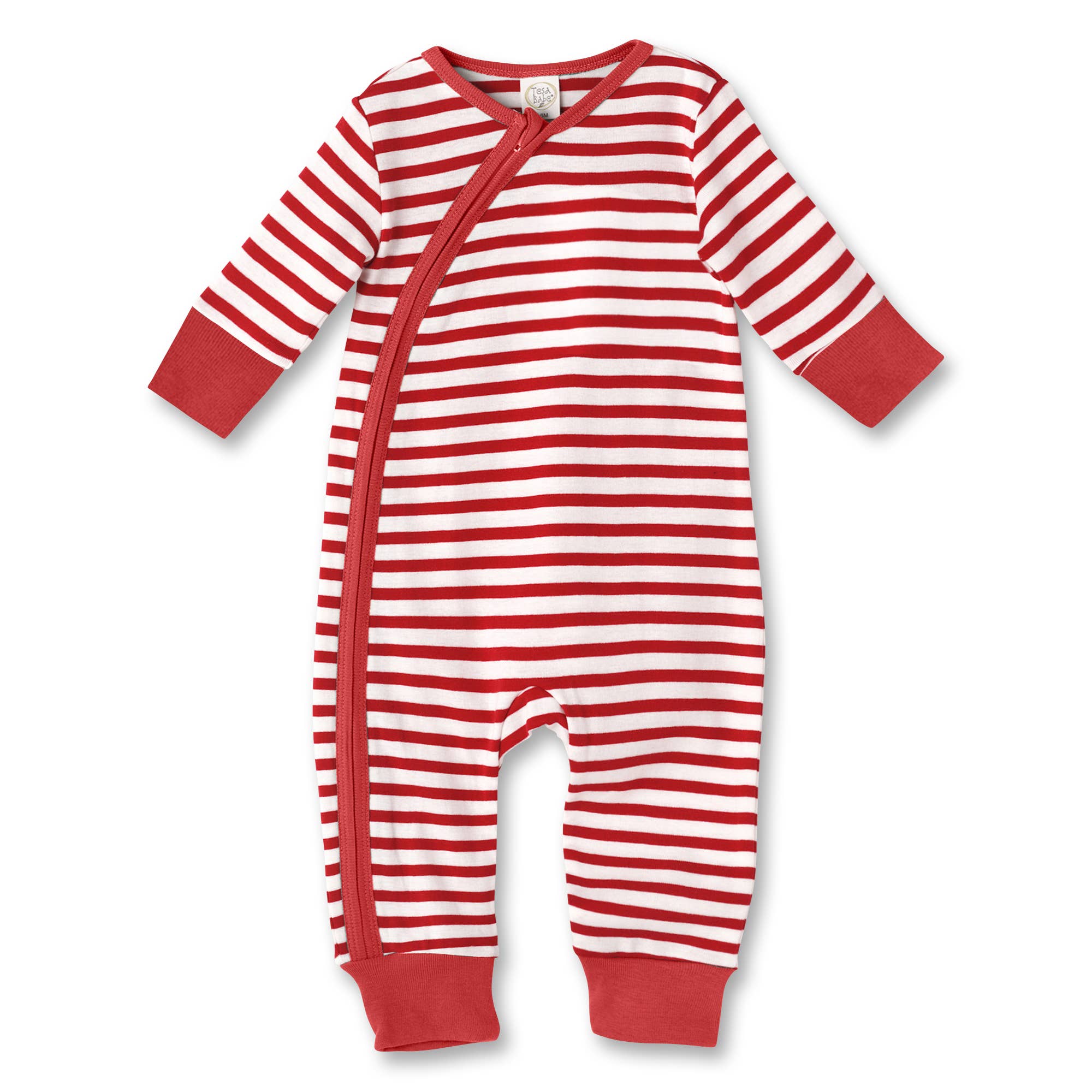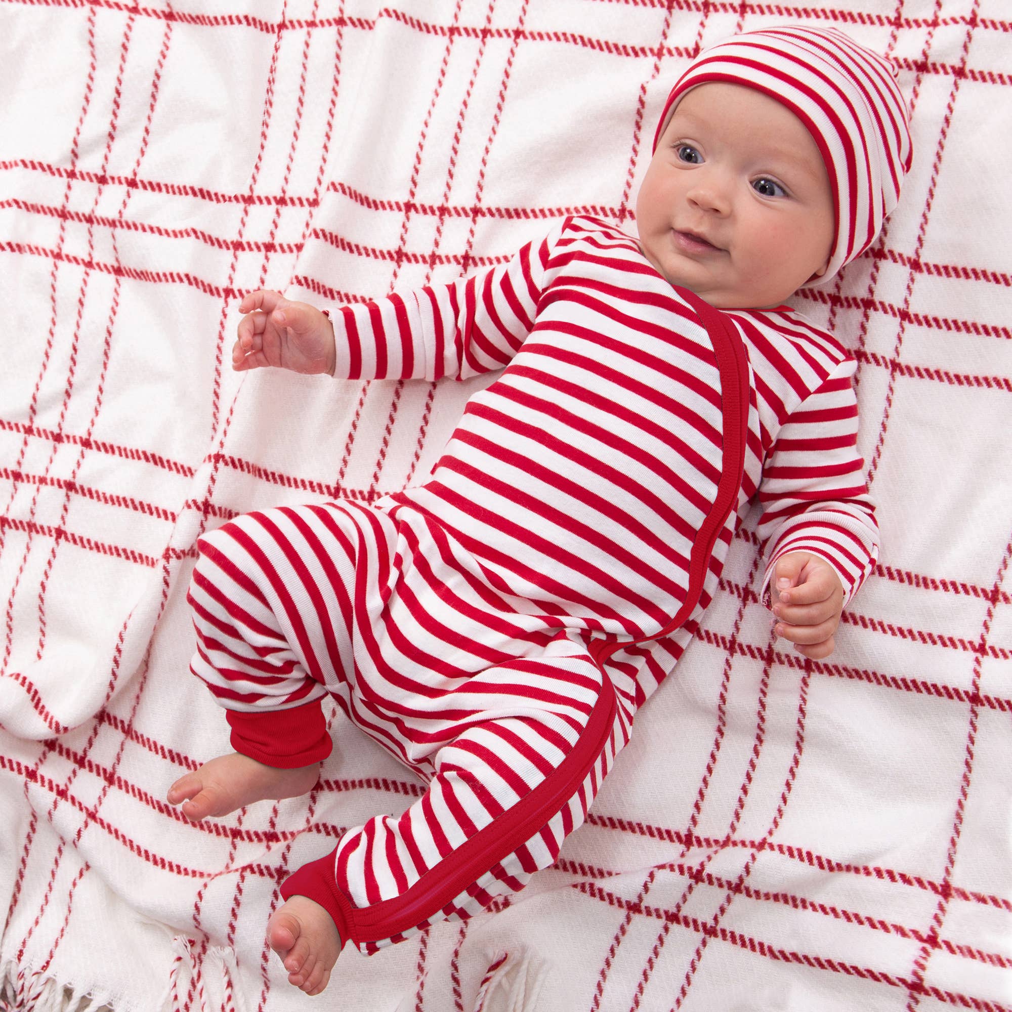 Red stripe Christmas romper with 2 way zipper closure. Baby will look cute and feel comfy in our soft yarn-dyed 100% cotton rib. Has neck guard for comfort.