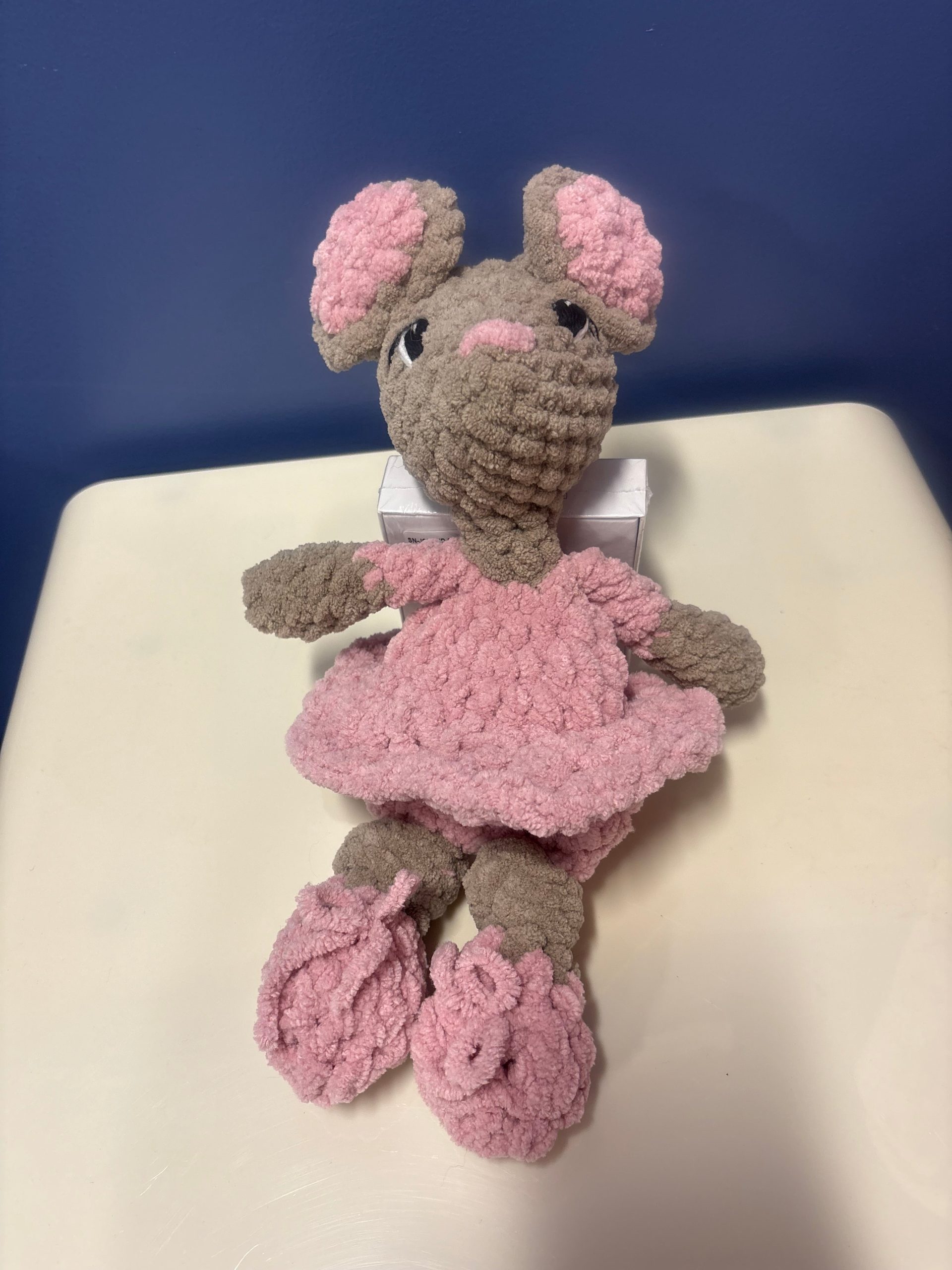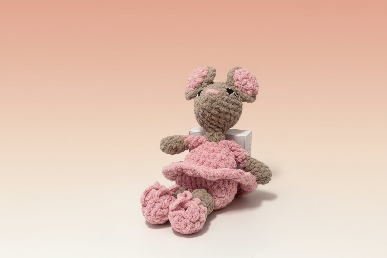 This handmade ballerina mouse is an irresistibly sweet and whimsical companion, lovingly crocheted from ultra-soft plush yarn. Her gentle gray body is accented with delicate blush-pink details, including her cozy tutu, dainty ballet slippers, and the soft inner lining of her ears. With her long, graceful neck, stitched eyes full of quiet expression, and tiny embroidered nose, she captures the elegance and innocence of a tiny dancer mid-performance.