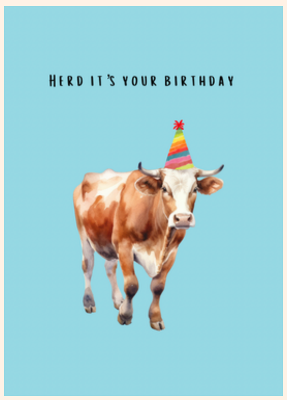 Bring on the birthday laughs with this pun-loving party cow! Featuring a watercolor-style cow in a rainbow-striped party hat and the cheeky phrase “Herd it’s your birthday”, this card is the perfect blend of cute and clever. Set against a cheerful sky-blue background, it’s sure to stand out and make someone smile.