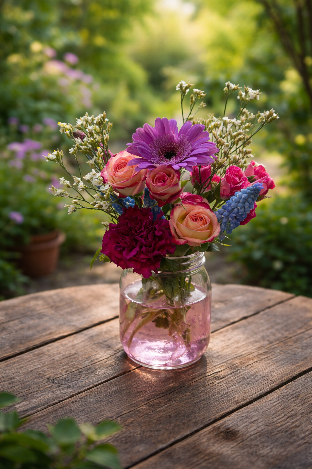 Soft, romantic, and just a little bit playful—this petite arrangement feels like a breath of spring on a windowsill. Designed in a charming glass jar, it features a vibrant purple gerbera daisy as the focal bloom, surrounded by delicate pink and peach roses, a rich magenta carnation, airy sprigs of white filler, and pops of blue grape hyacinth for an unexpected twist.