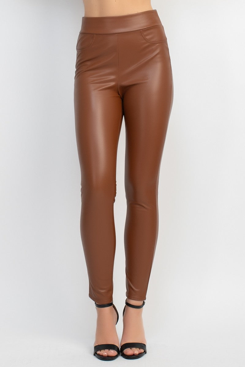 These brown pleather leggings combine modern style with exceptional comfort and are fleece lined. Crafted from a blend of polyester, rayon, and spandex with a 100% polyurethane coating, they offer a sleek, faux leather finish. Designed with a high-rise and wide elastic waistband, these full-length, skinny-leg leggings provide a flattering fit that moves with you, making them ideal for both casual and dressier occasions.