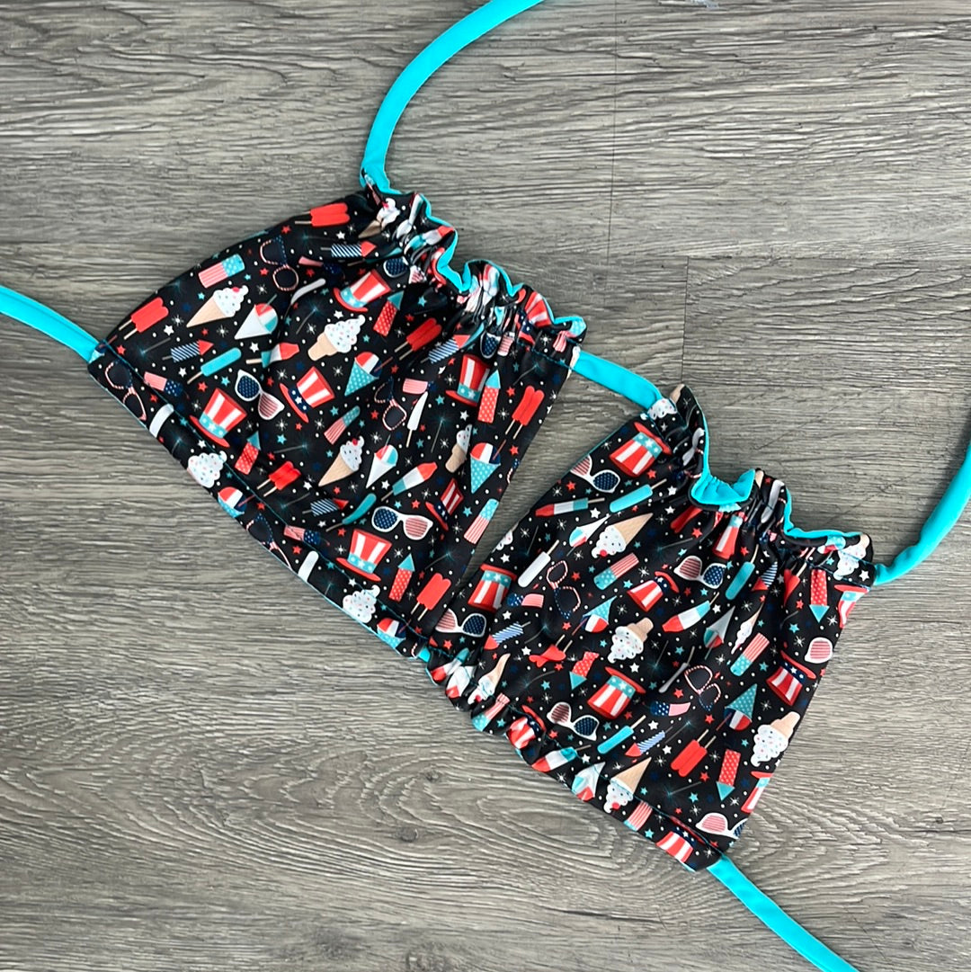 Make your Fourth of July just as lively as the holiday with our new ditzy top. A colorful combination of red, white, and blue details on a black background reverses to a solid light blue for added versatility.Matching Bali Bottom HEREMatching Zoey Bottom HEREMatching Triangle Top HEREMatching Pony Top HEREMatching Scrunchie HERE