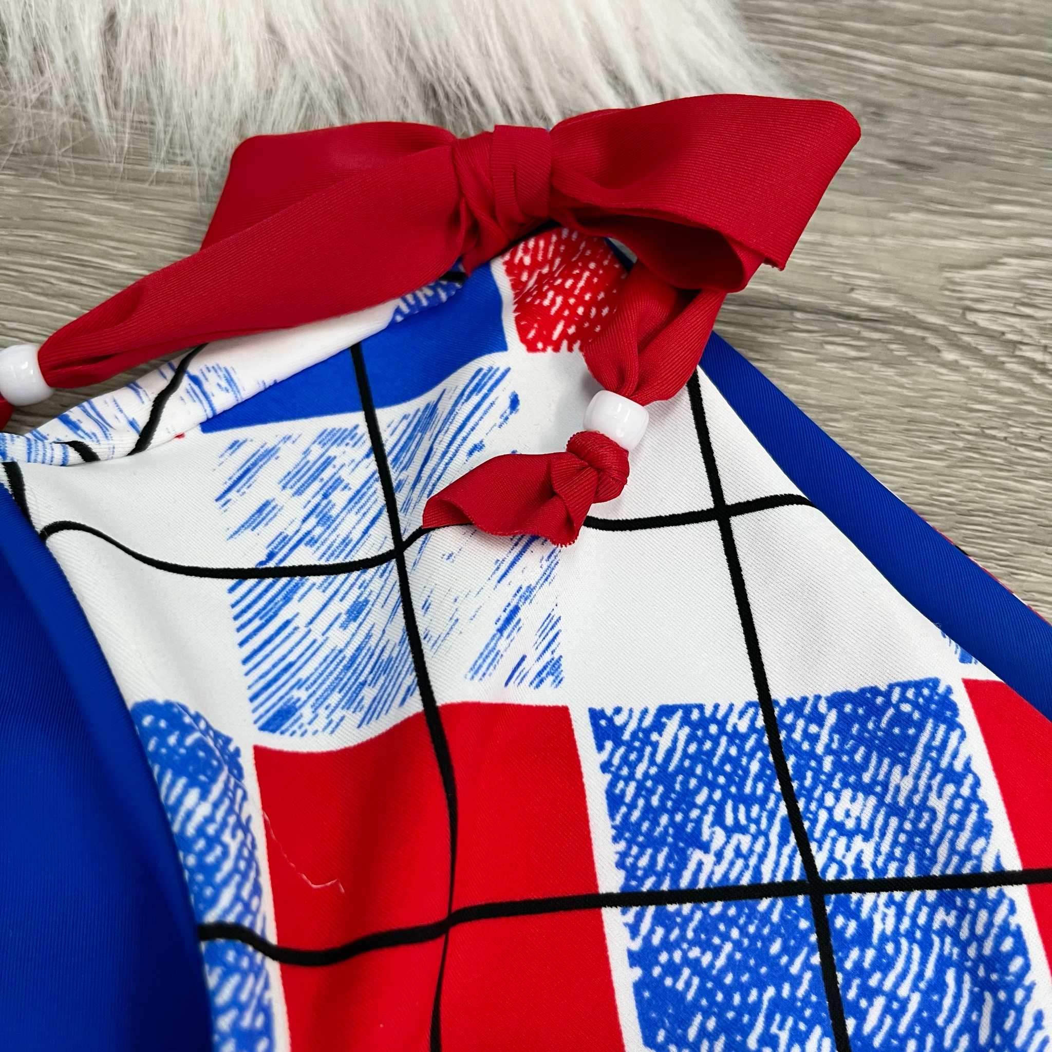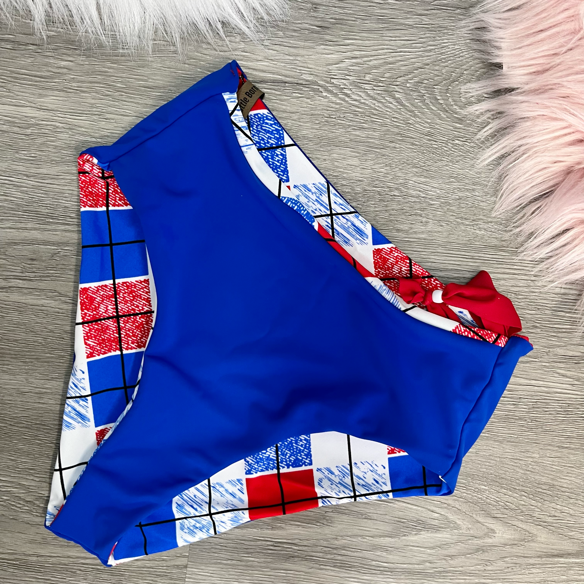 This full coverage bottoms feature a cute hip bow on the right hip. Red, White, and Blue checker print reverses to solid blue. XS fits a Children’s size 16