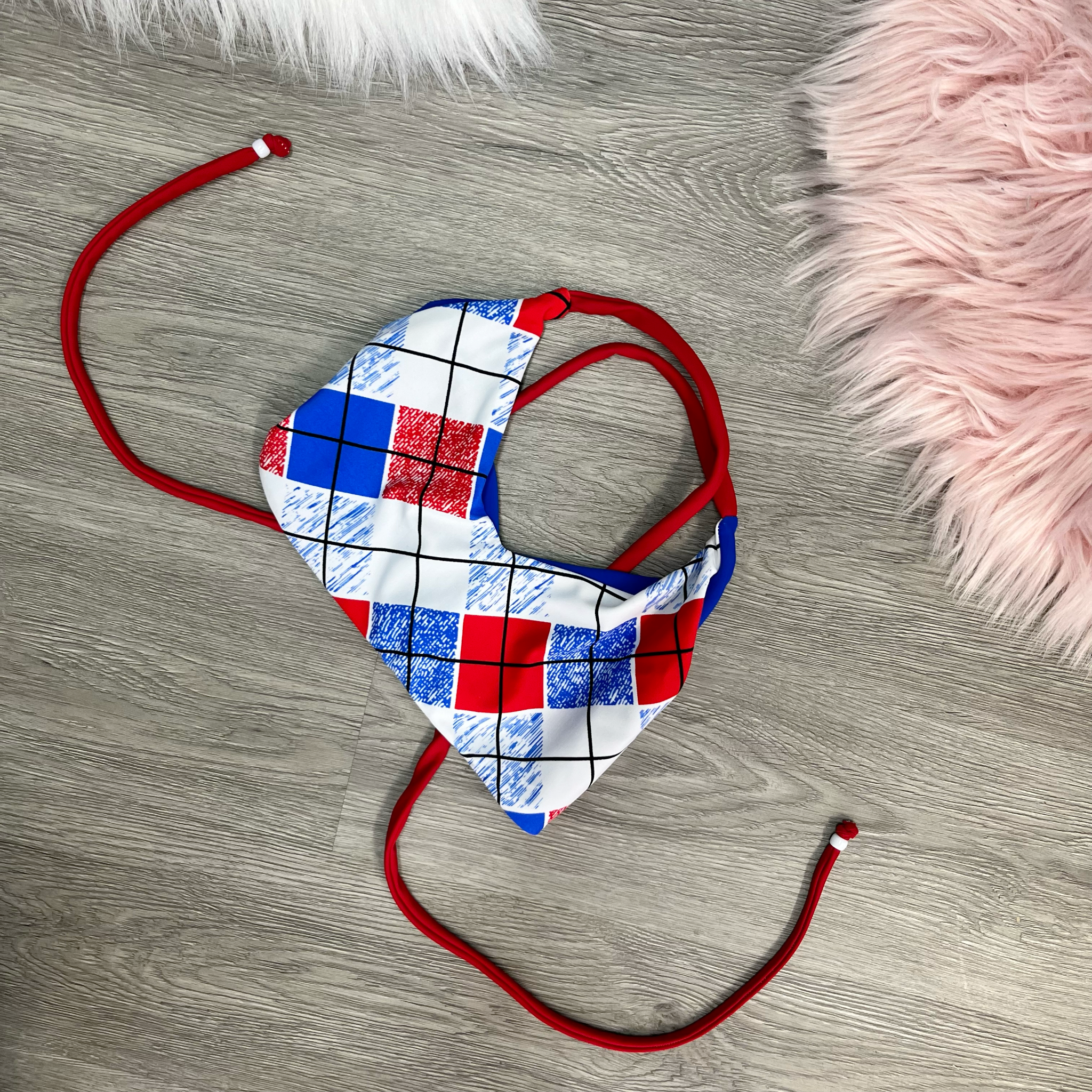 This sporty top has crisscross back straps that are adjustable and tie on the back. Red, White, and Blue checker print reverses to solid blue with red straps.
