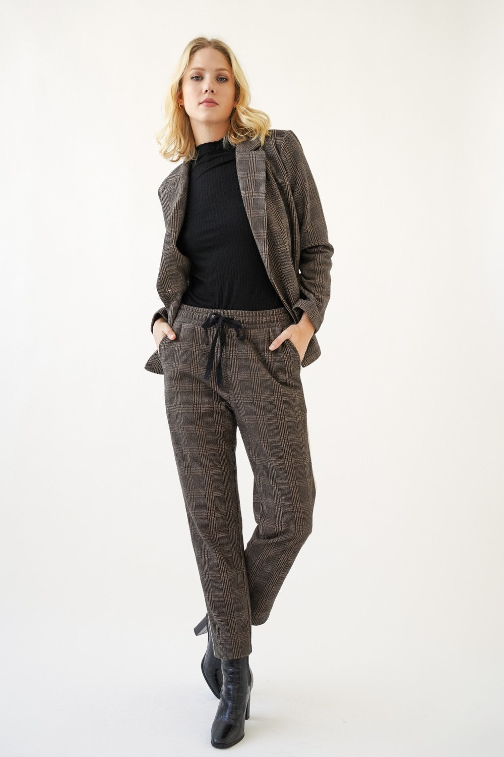 These Knit Checkered Pants with Side Trim combine comfort and style with precision tailoring. Crafted from a soft knit fabric, they offer flexibility and ease of movement, while the subtle checkered pattern adds a refined texture. The side trim detail elongates the silhouette, creating a sleek and polished look suitable for both casual and professional settings. Ideal for those seeking a sophisticated yet comfortable wardrobe staple.