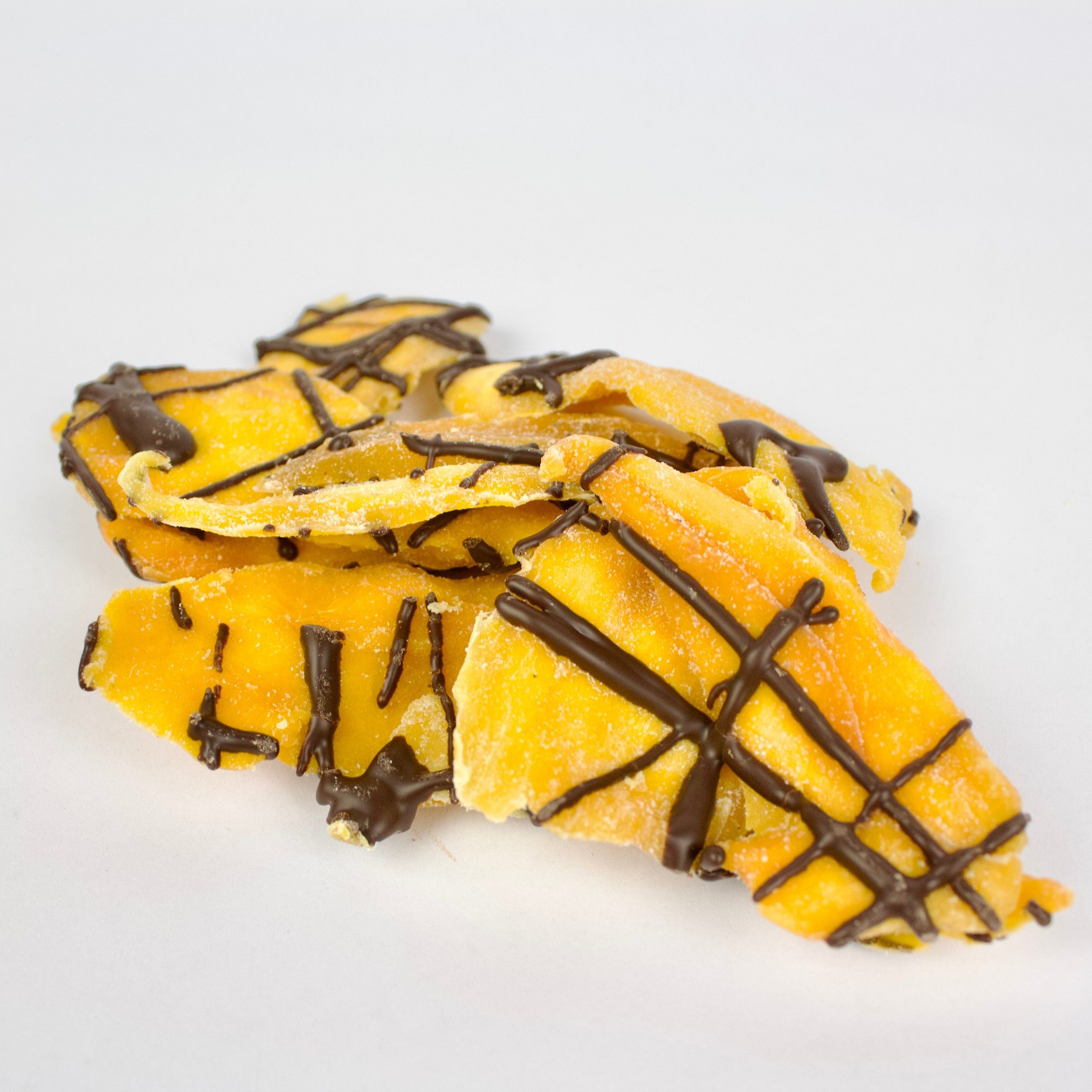 These sweet and tangy dried mangos are hand-drizzled in a silky 62% Valhrona Dark Chocolate. Each bag comes in a 1/4 pound measurement.