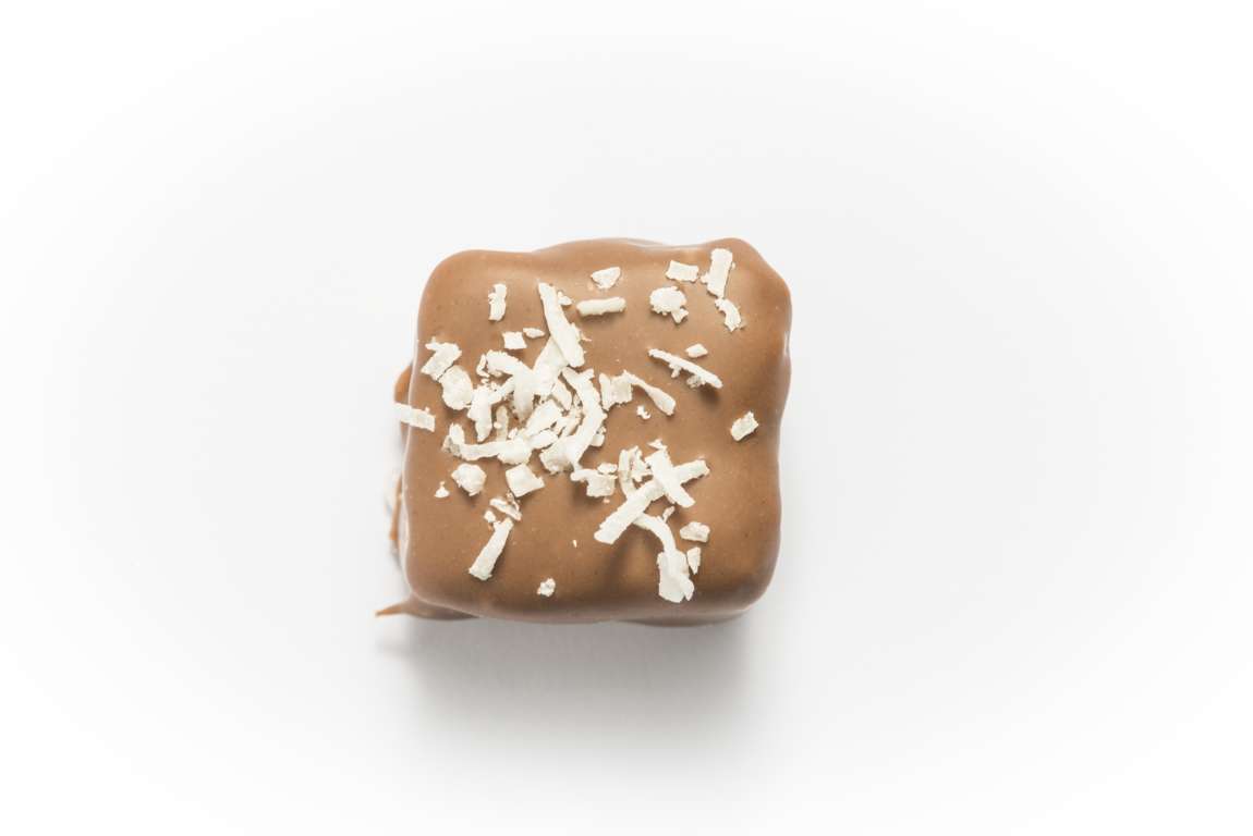 This bonbon is a chewy yet creamy delight that will transport your taste buds to someplace tropical! The white chocolate coconut flake ganache is enrobed in milk chocolate and sprinkled with coconut flakes.