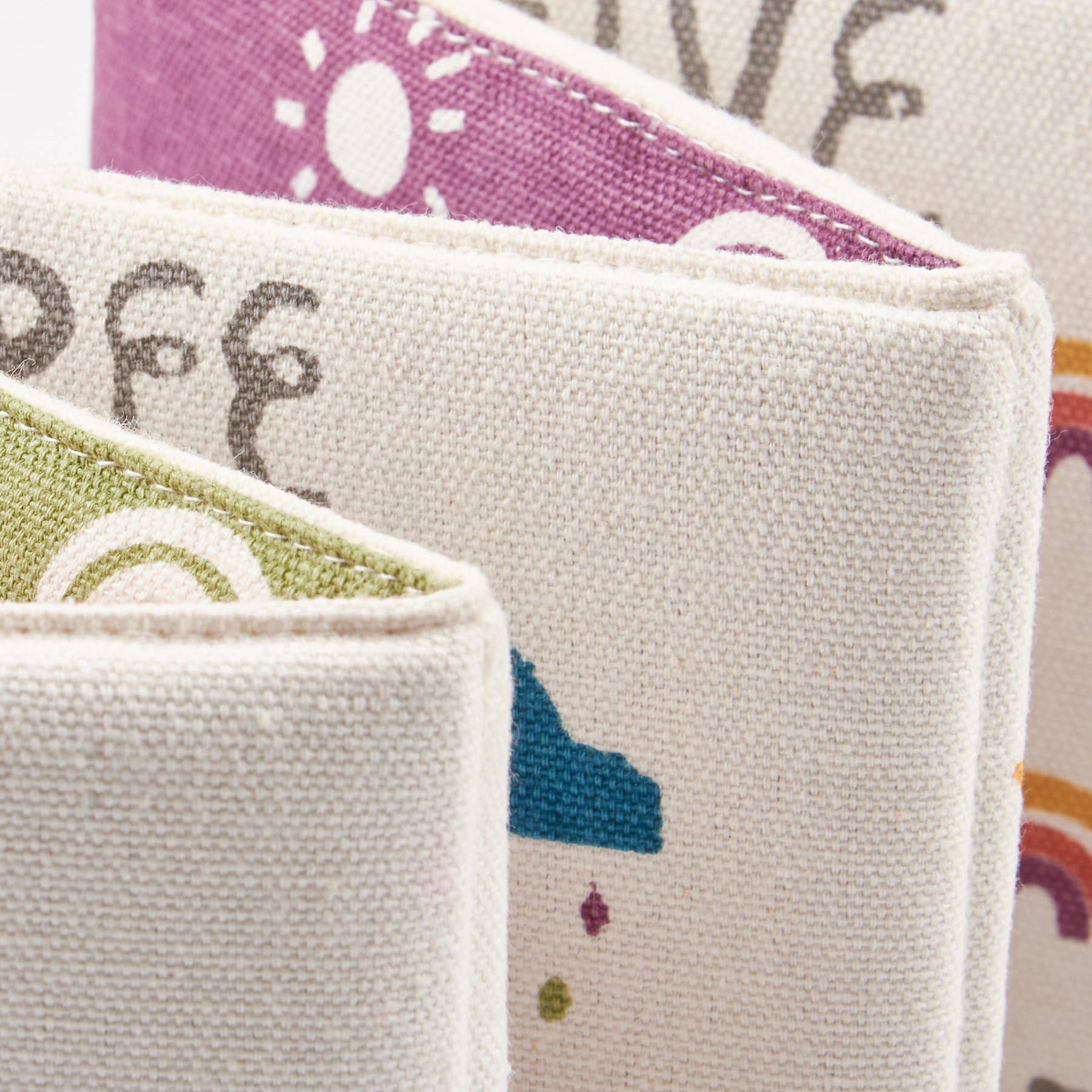 A fun soft book for infants with a charming rainbow and sky theme on each page. Soft book unfolds to reveal five panels with unique block print art designed to introduce counting and colorful repeating patterns on the back. Includes fabric straps at the top to tie shut for storage. The Counting Sun And Rainbow soft book is another adorable addition to our exclusive Happy + Bright Collection.