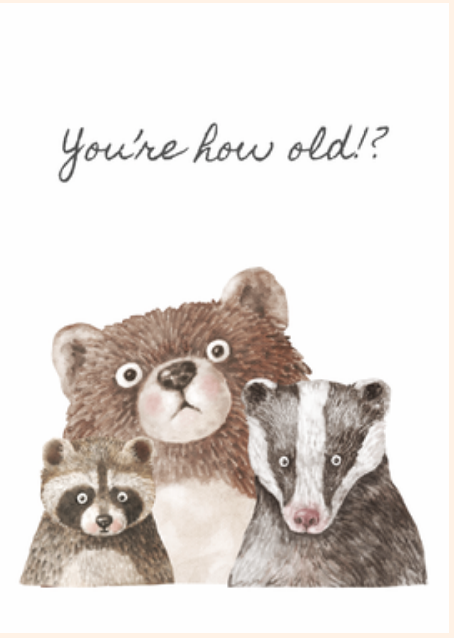 Celebrate with a little sass and a lot of fluff! This Furry Friends Birthday card features a bear, raccoon, and badger—all wearing party hats and giving you their best confused-and-concerned faces. With the hilarious phrase “You’re how old?” above them, it’s the perfect card to poke fun at aging in the most adorable way.