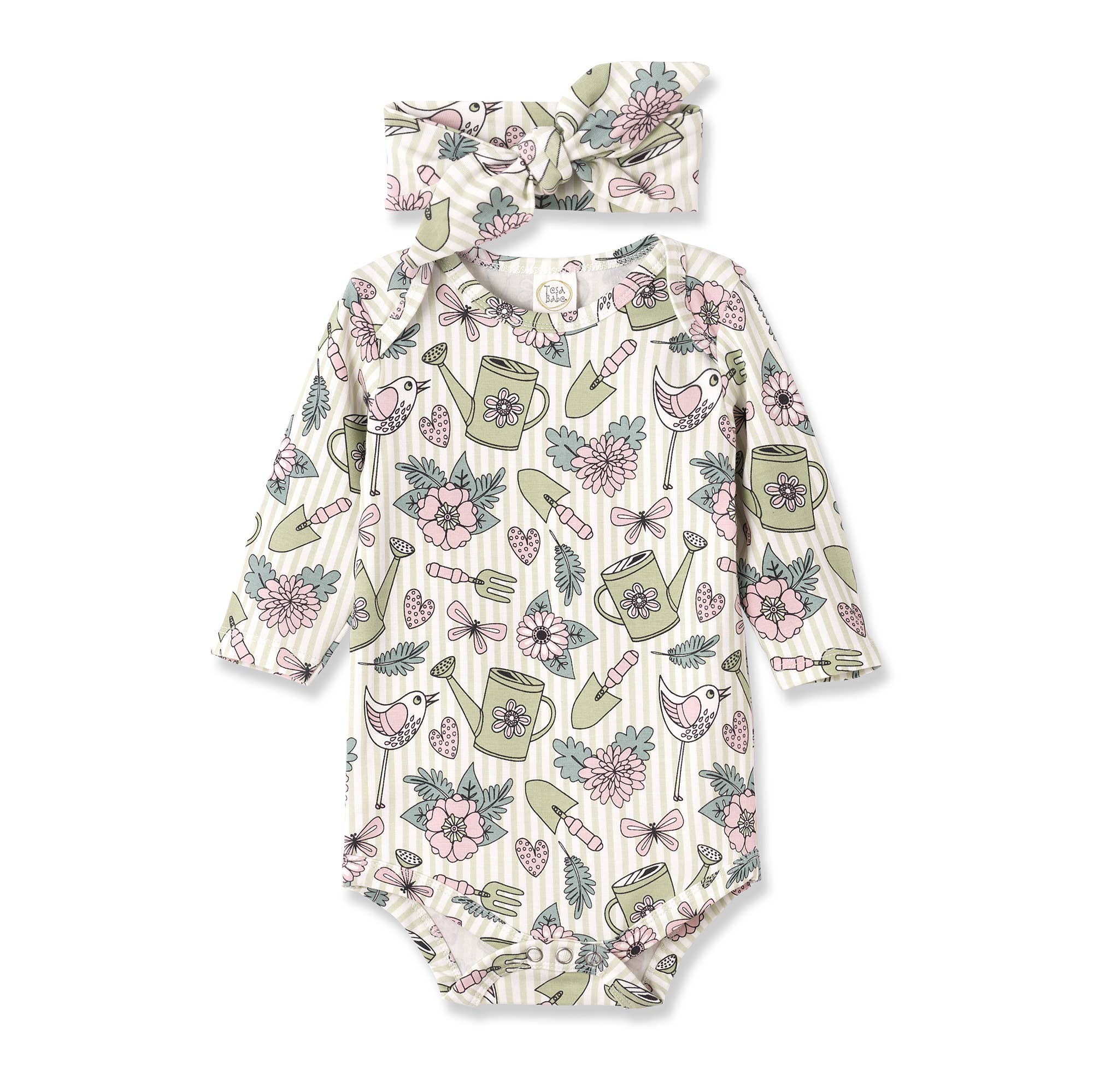 This bodysuit & headband set brings style and comfort to every little wardrobe! Featuring a sweet garden print with a matching headband, this duo is perfect for adorable everyday looks. The bodysuit includes an envelope neck and bottom snaps for quick and easy changes, while the headband can be re-tied for the perfect fit. Made from an ultra-soft bamboo/spandex blend and cotton rib, it’s absorbent, hypoallergenic, and oh-so-comfy. Machine wash warm and tumble dry low.