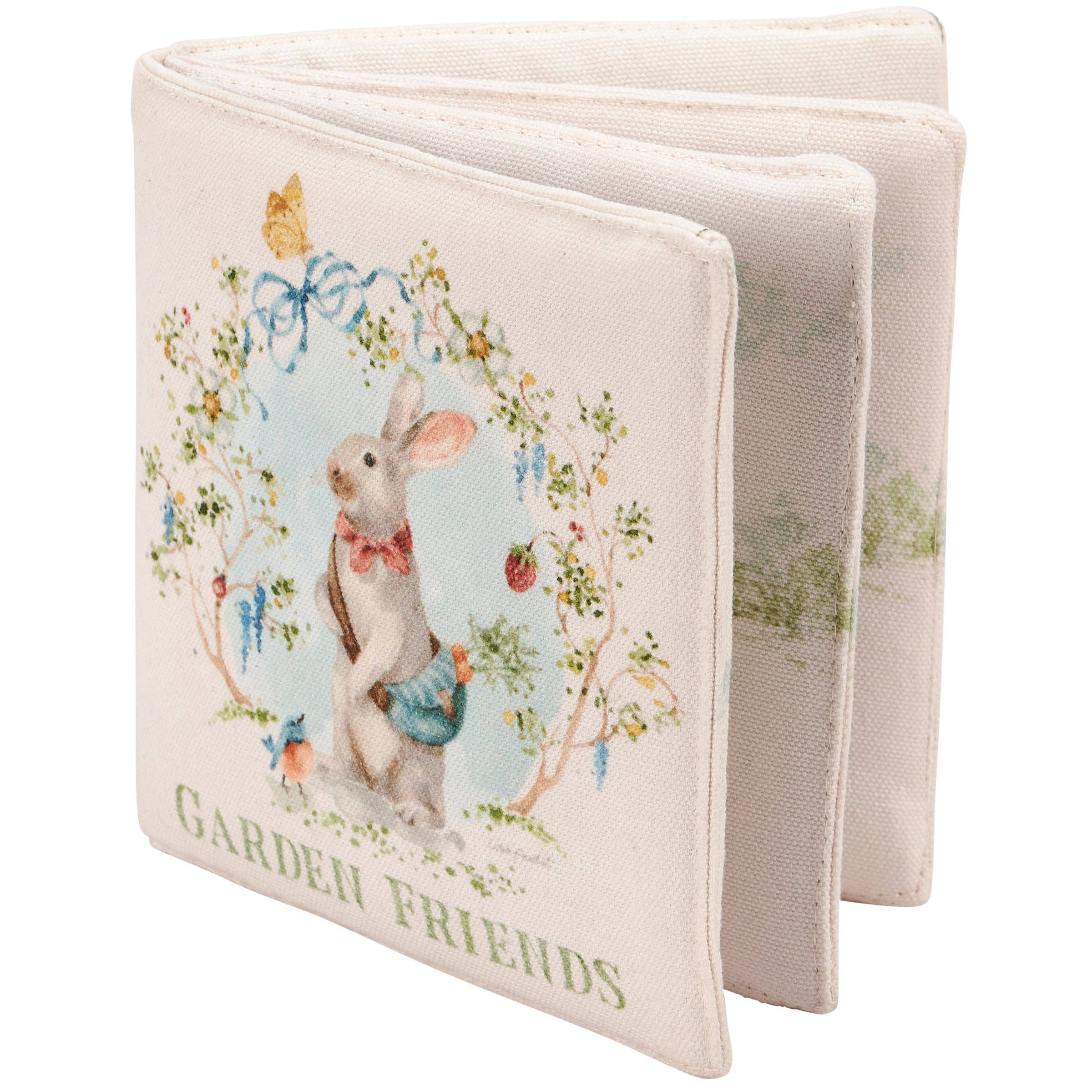 A colorful soft book from our Baby & Kids Collection featuring charming garden animal designs on each page inspired by children’s story book illustrations. Garden designs are replicated from original art hand painted in a delicate watercolor style. Soft book unfolds to reveal a different animal with embroidered details and engaging sensory elements including crinkle paper, velvet, and faux fur to encourage touch and play perfect for ages 6 months and up. Our Garden Friends soft book is a cute garden-themed gift for baby showers or everyday moments.