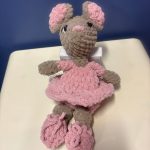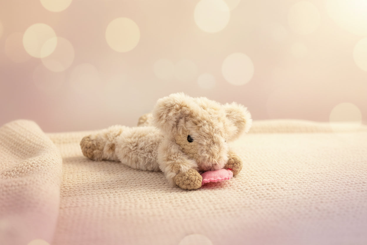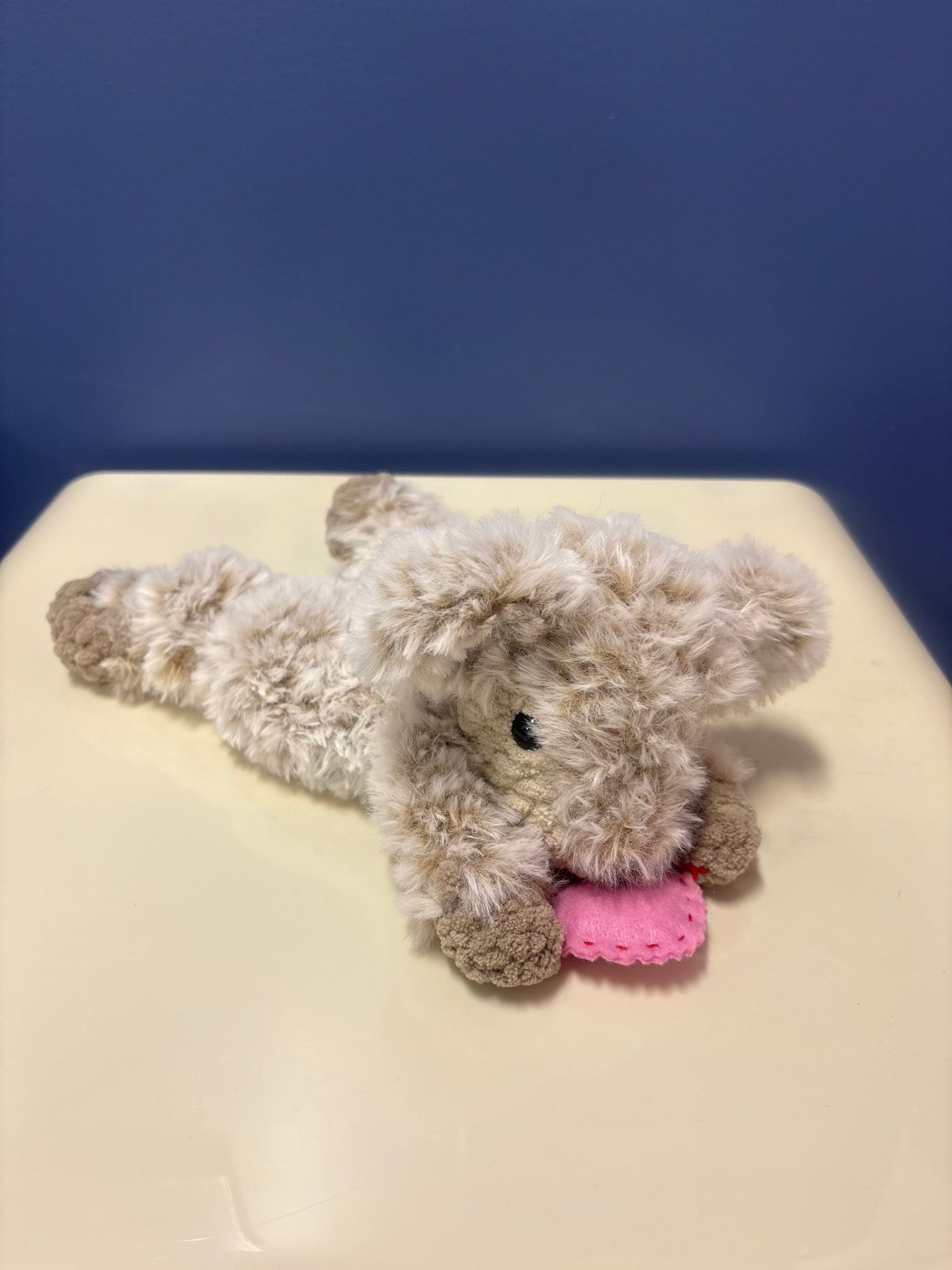 She rests peacefully on her belly, with her delicate crocheted hooves tucked beneath her and her soft ears slightly perked, as if listening to the quiet magic around her. Between her front hooves, she holds a tiny pink felt heart, lovingly stitched and full of meaning, symbolizing comfort, love, and companionship.