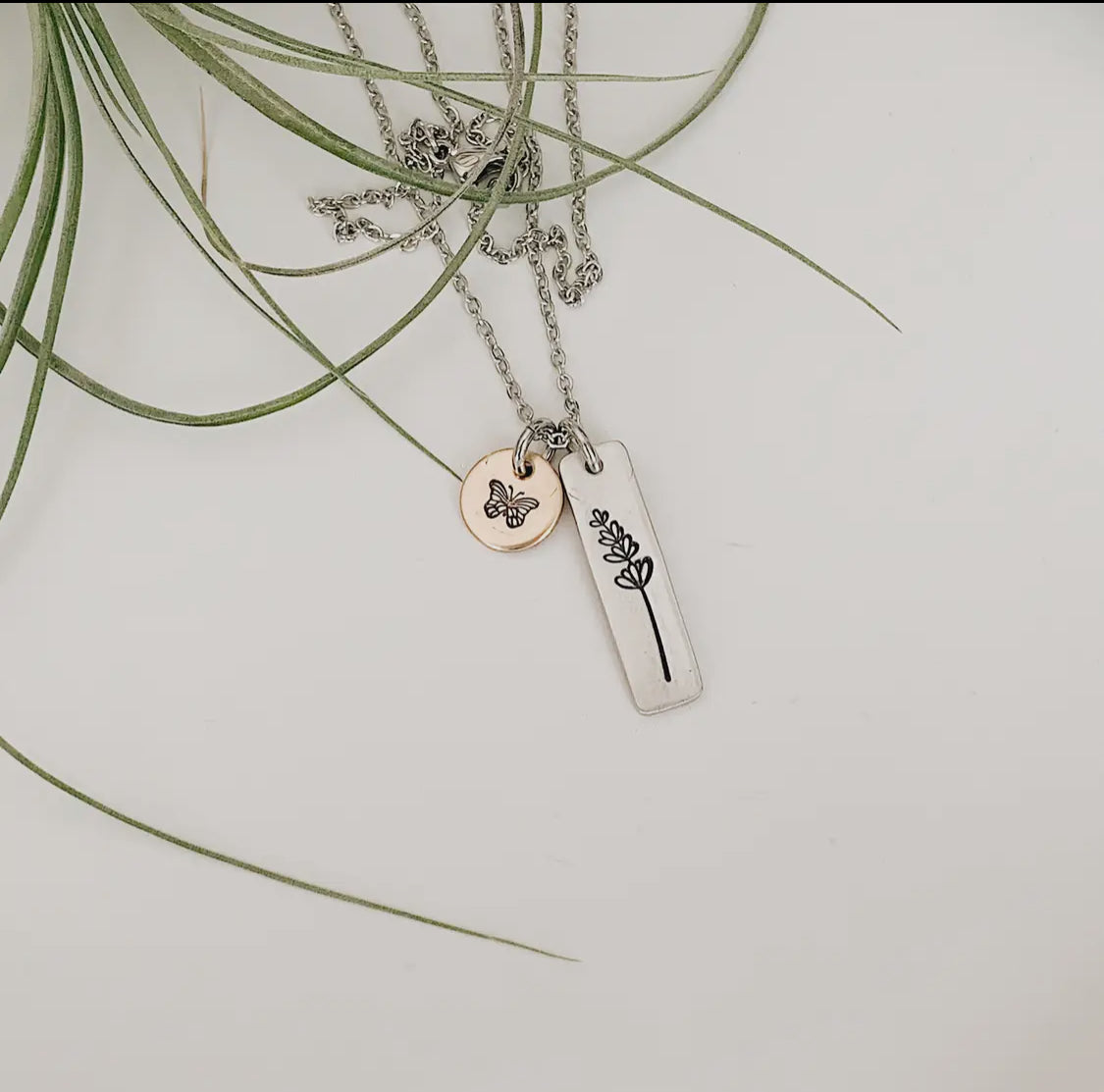 Delicate and full of meaning, this hand-stamped necklace features a graceful butterfly in flight alongside a sprig of lavender — symbols of transformation, peace, and quiet strength. Crafted in shimmering gold and silver, the pendant hangs from a dainty chain that layers beautifully or stands softly on its own. A thoughtful gift for someone beginning a new chapter — or a gentle reminder to yourself that growth is beautiful.