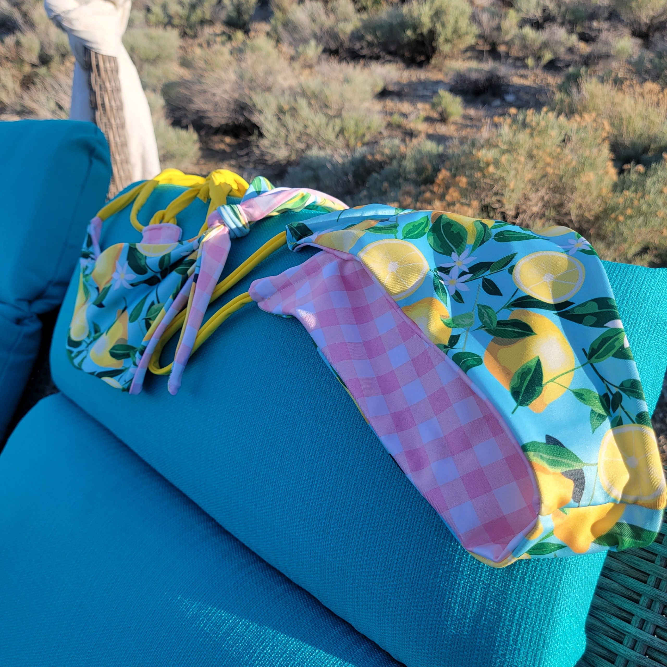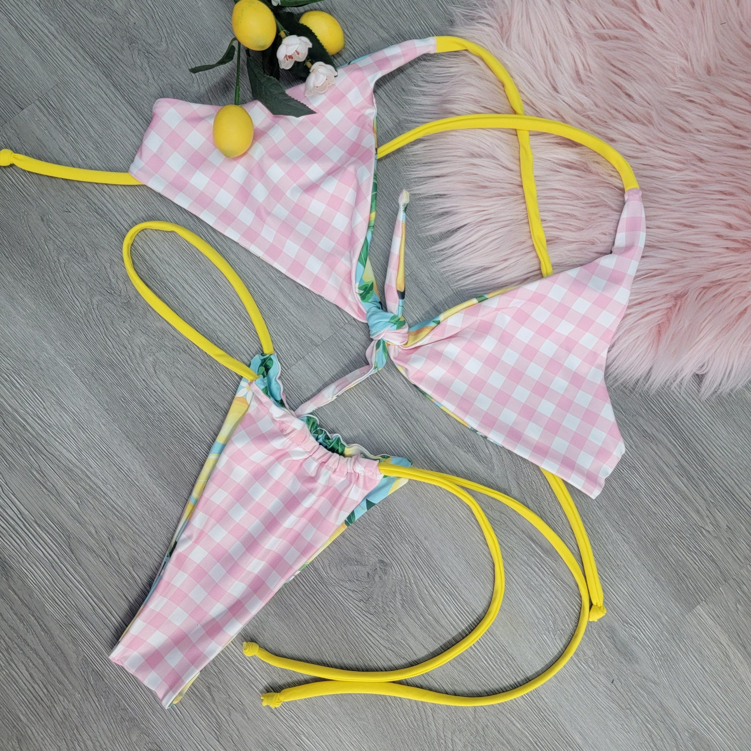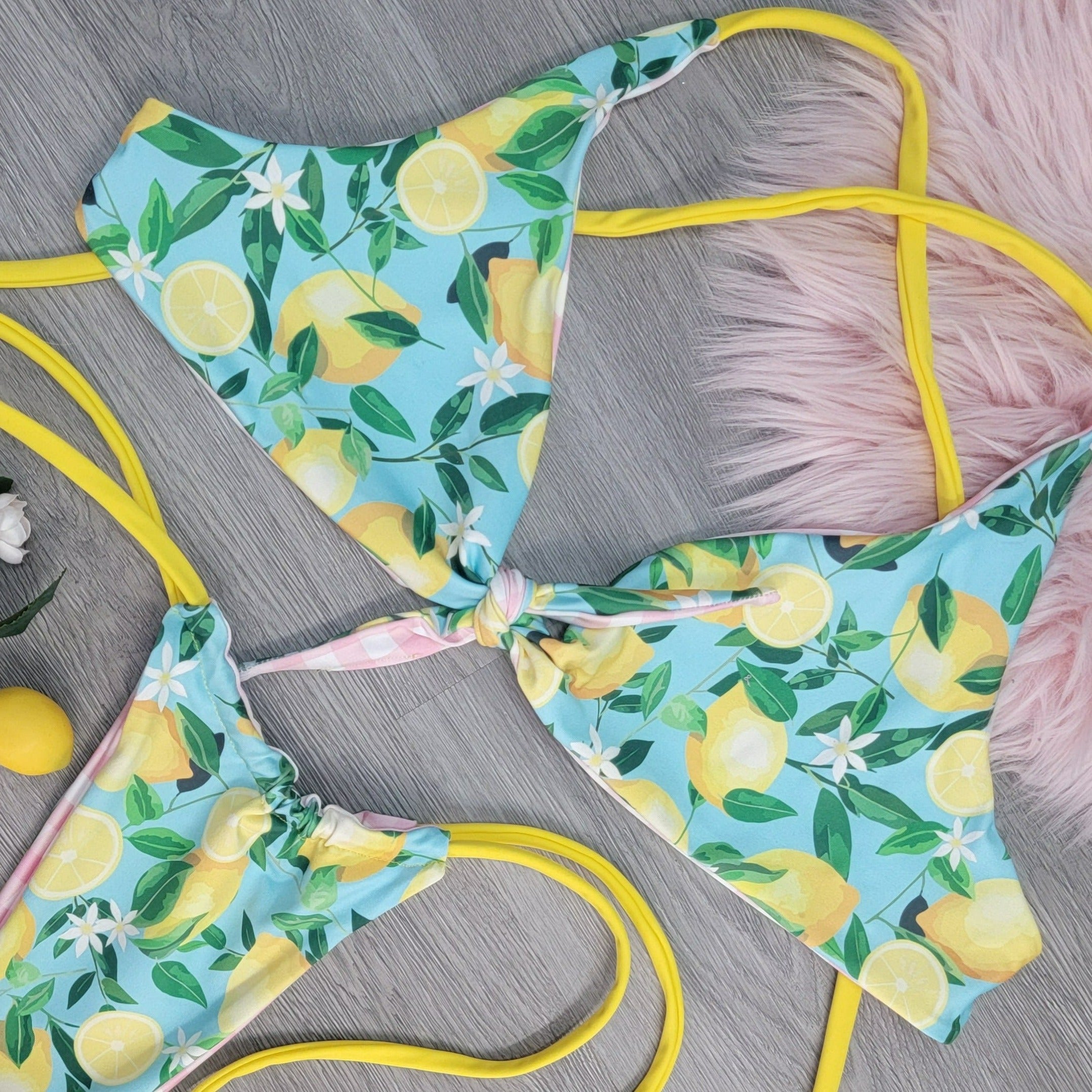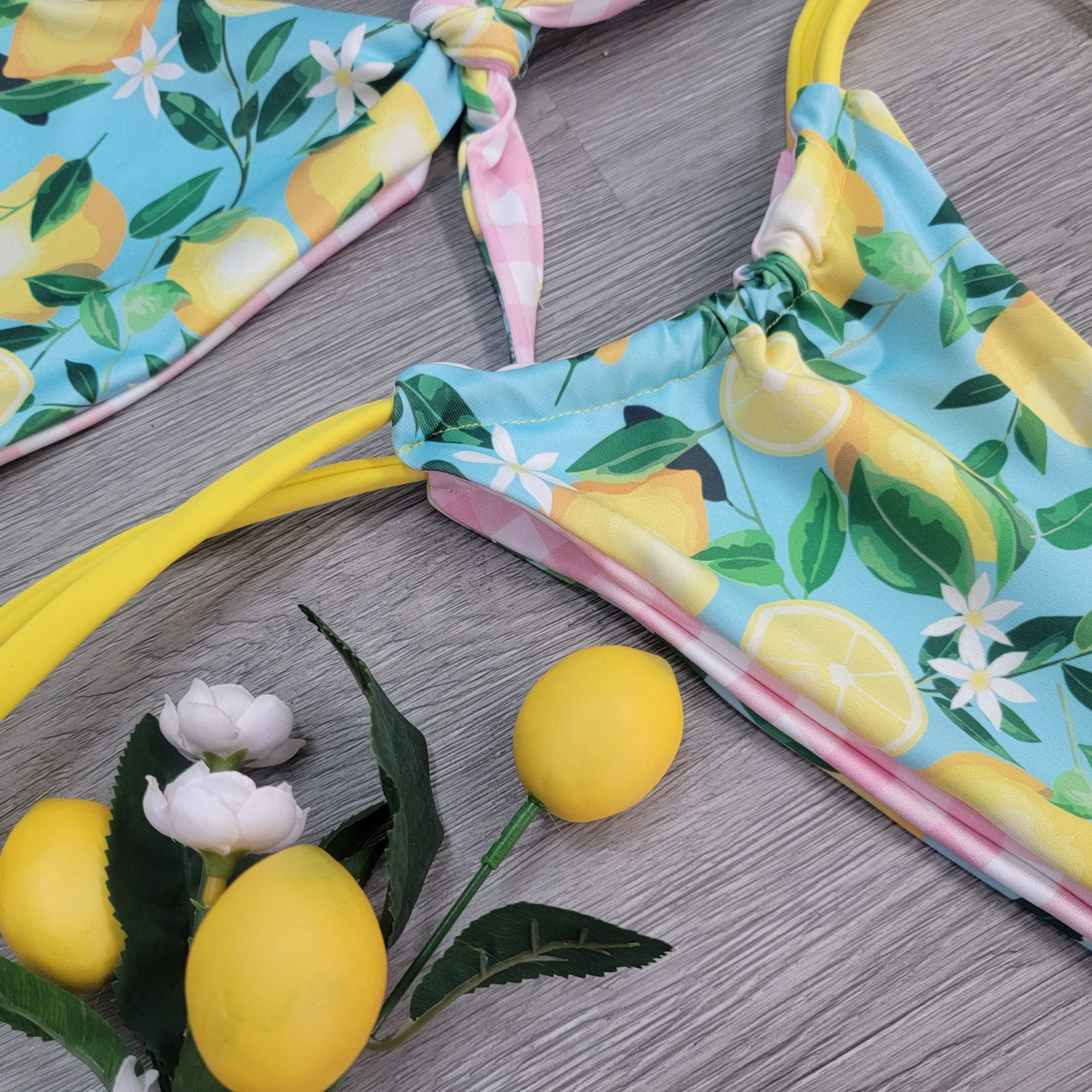 Our bikini tops are made from luxurious spandex, providing an amazing fit and lasting comfort. Show off your southern charm with this pink gingham and lemons on teal reversible bikini. Yellow straps, accented with adjustable criss-cross ties. This is made for those who are confident and comfortable in their own skin. Wear it to the beach or a pool party and you will be sure to turn heads!
