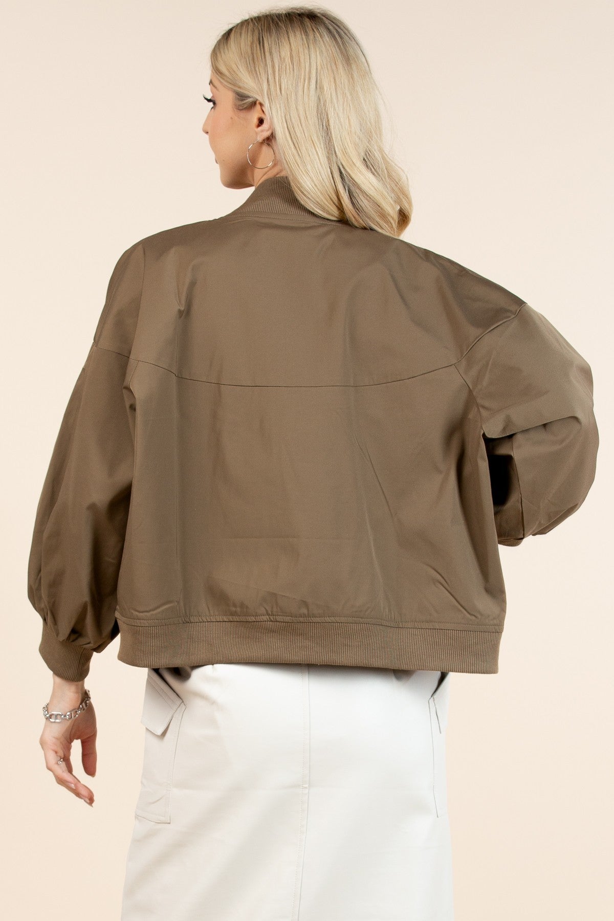 The perfect lightweight spring bomber for every season. This versatile jacket looks fabulous styled with jeans, shorts, or your favorite spring dresses. Featuring functional pockets, a sleek silhouette, and structured fit, it effortlessly transitions from casual to dressed-up occasions. An essential layering piece that pairs with any wardrobe. Fits true to size.