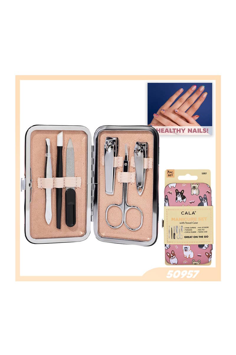 CALA 50957 Manicure Set with Travel Case Dog Print. A stylish grooming kit designed for maintaining nails while on the go. The set includes two nail clippers, offering precision for trimming both fingernails and toenails. It also features a pair of high-quality tweezers, perfect for shaping brows or removing unwanted hair with ease. The cuticle pusher gently pushes back cuticles for a neat and polished look, while the nail scissors provide a sharp and clean cut for any nail trimming needs. Additionally, the included nail file allows for smooth and even shaping, ensuring nails are perfectly finished. Packaged in a compact and cute travel case with an adorable dog print. Keeps all tools neatly organized and easy to carry, making it perfect for travel or quick touch-ups anytime, anywhere. 6 sets in box.