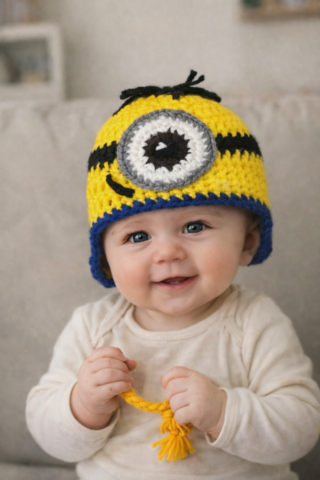 This cheerful hand-crocheted baby hat is inspired by a playful, one-eyed cartoon character look that’s instantly recognizable and full of fun. Made with bright yellow yarn, a bold single eye detail, and contrasting accents, this hat brings humor and personality to any little one’s outfit.