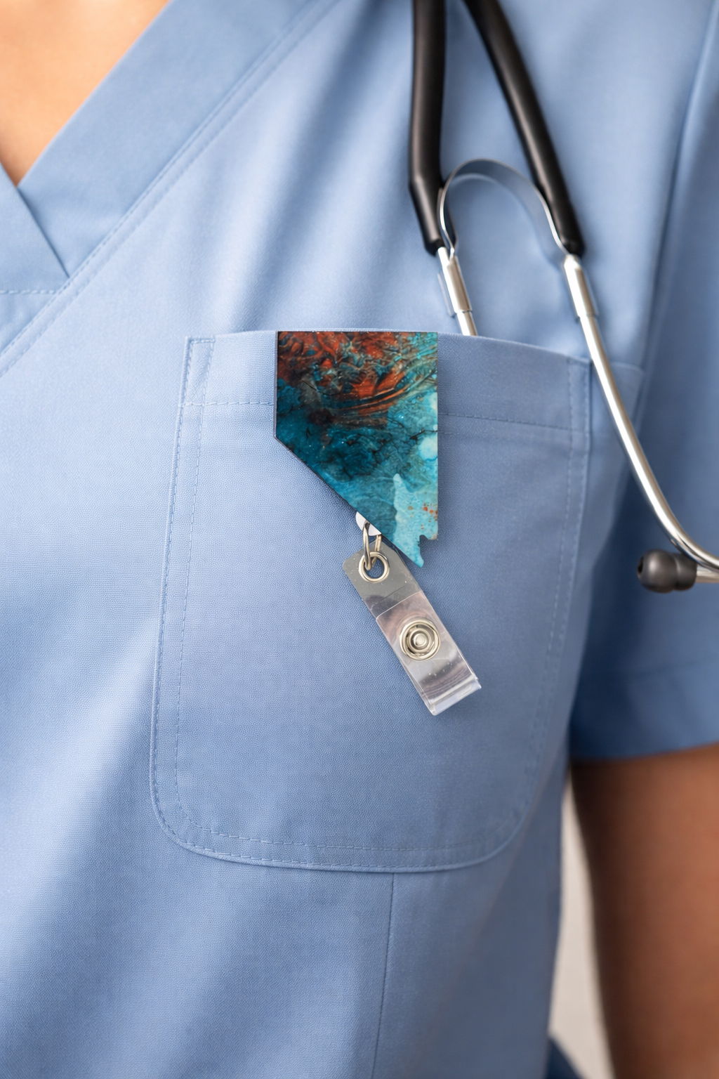 Each piece features a beautifully finished Nevada silhouette with rich, marbled tones that make every badge reel unique. Designed to clip easily onto a scrub pocket, lanyard, or belt loop, it keeps your ID secure while allowing for quick, convenient access throughout the day.