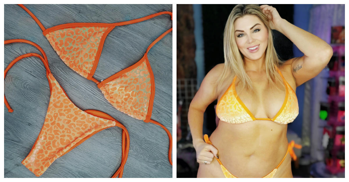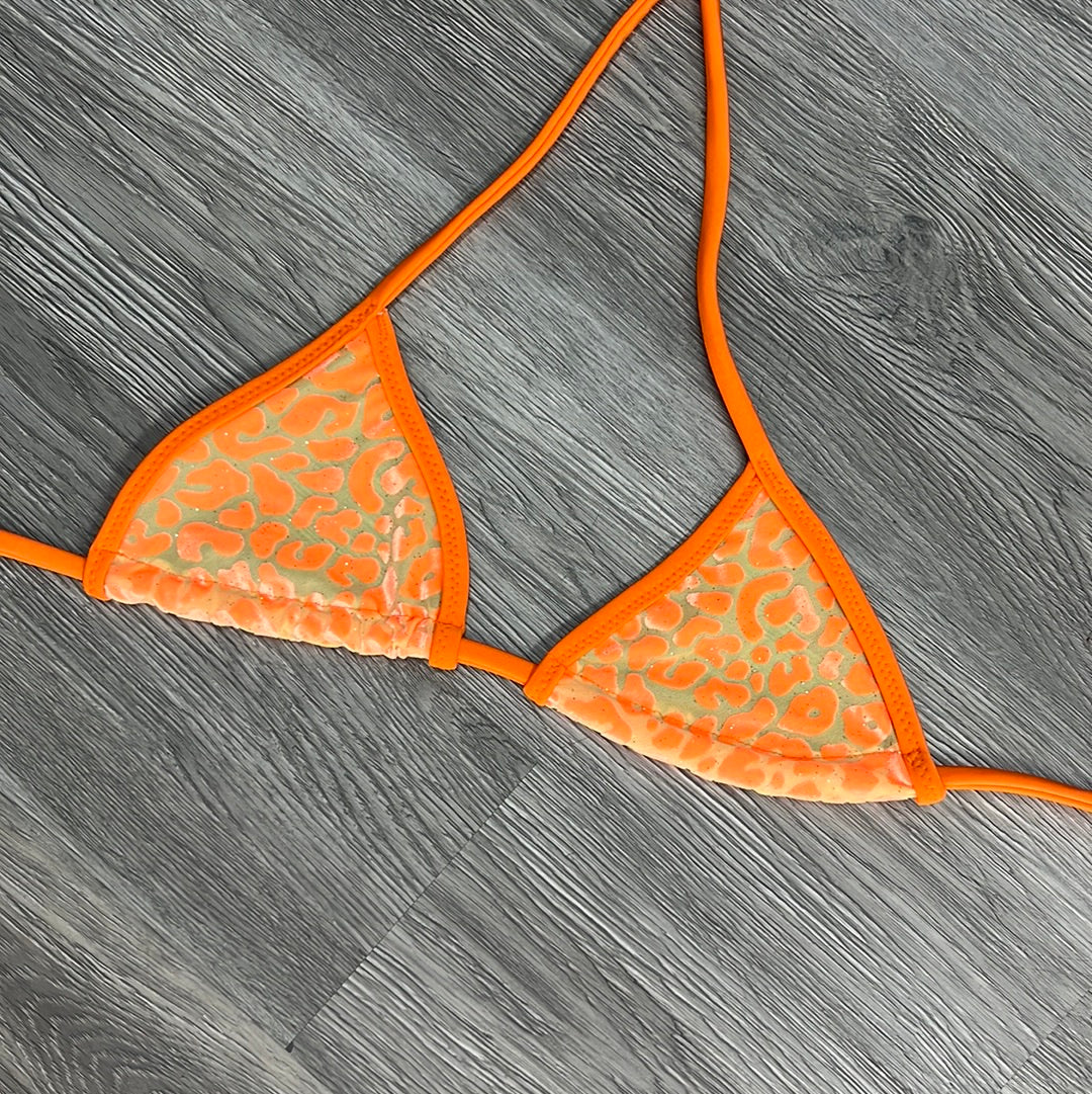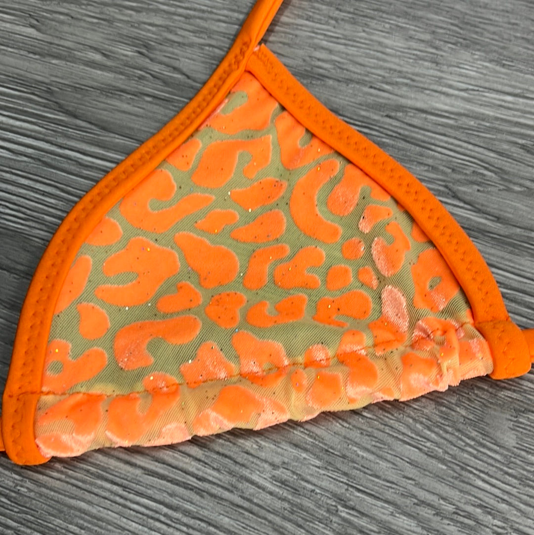 Show off your body with this little number that makes a great statement. Orange mesh with leopard print and a sparkle of gold glitter triangle top. With florescent orange straps! Add some pasties for a fun night out or a day at the lake!