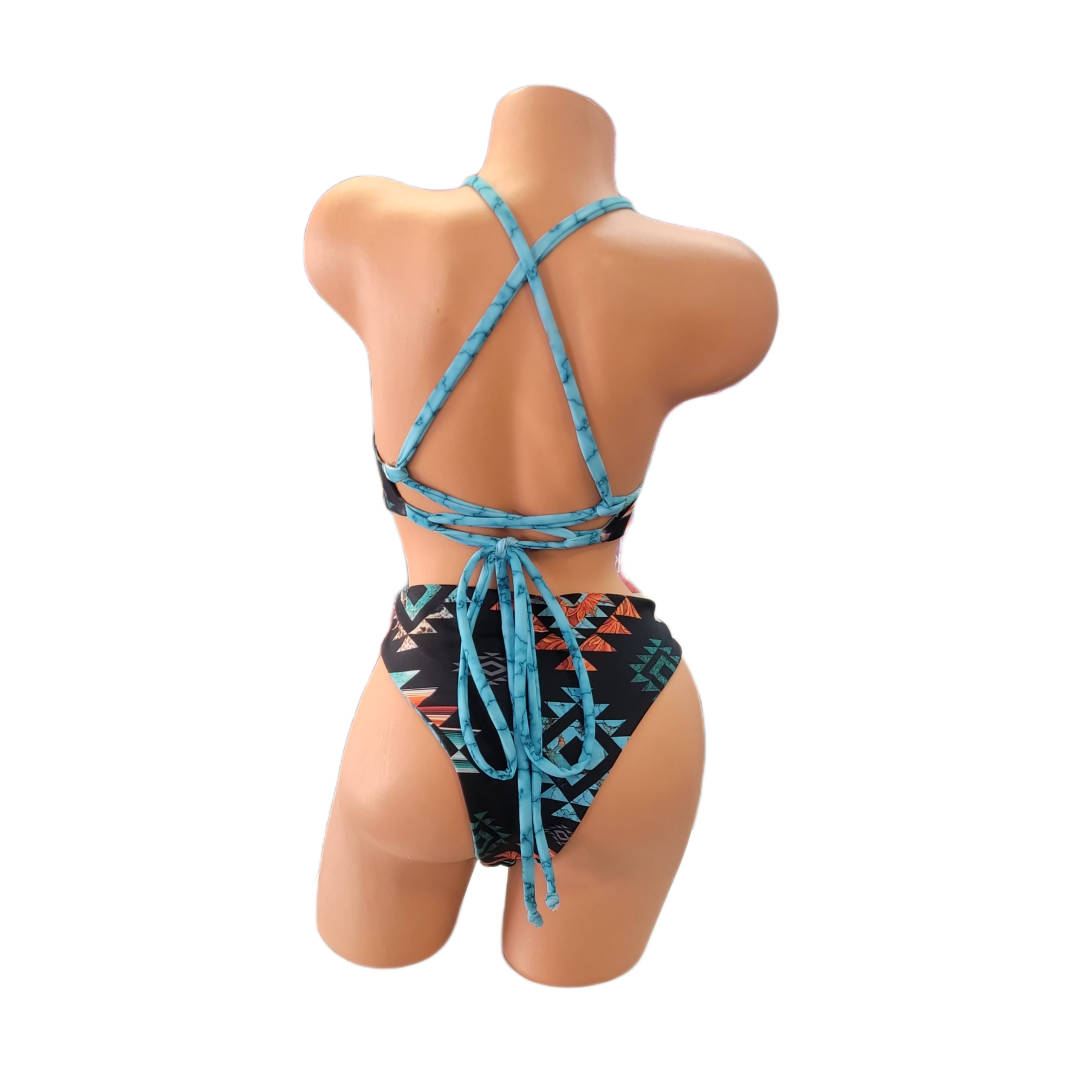 Fun and flirty, these bottoms feature a bold Aztec pattern on a sleek black base that can be flipped to a playful turquoise. High-waisted with a cheeky cut, these are perfect for the adventurous fashionista.Matches: