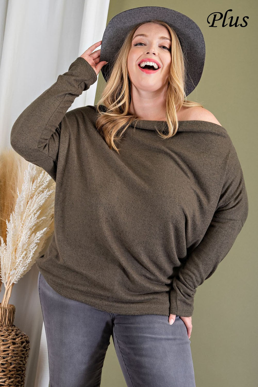This oversized olive tunic top features an off-shoulder design that combines relaxed comfort with contemporary style. Crafted for versatile wear, it easily transitions from casual daywear to elevated evening looks. Its long sleeves add warmth without compromising breathability, making it an ideal layering piece for varied weather. The flowing silhouette enhances movement while flattering a range of body types, ensuring both functionality and fashion-forward appeal. Sizing is plus for a relaxed tunic look.