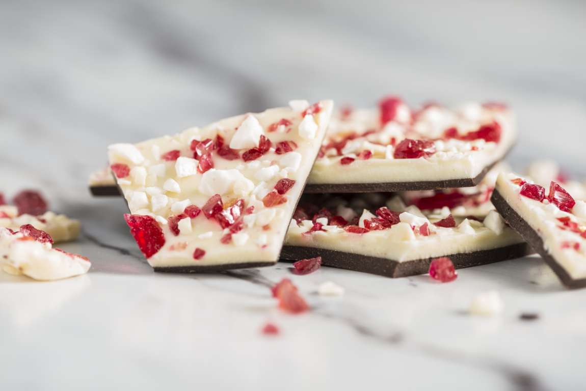 A half-pound of the perfect blend of thin dark chocolate and white chocolate sheets, topped with crushed peppermint candy! We use beet juice instead of Red Dye 40 to color our peppermint candy, meaning this all-natural treat is guilt-free.