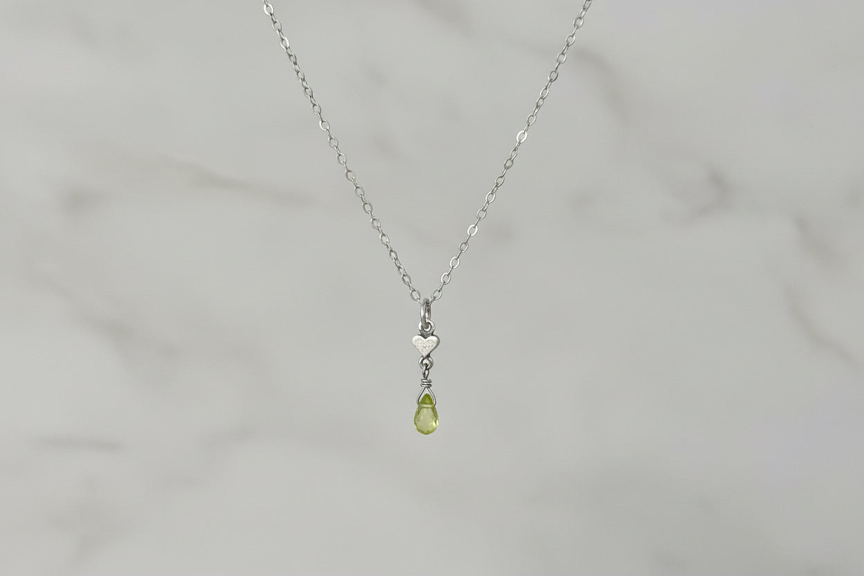 A delicate sterling silver necklace featuring a petite silver heart charm and a faceted peridot teardrop gemstone. The soft green peridot catches the light beautifully, adding a subtle pop of color and natural sparkle. Simple, elegant, and easy to layer, this piece is perfect for everyday wear or as a meaningful gift symbolizing love, renewal, and positive energy. Crafted in sterling silver for a timeless, understated finish. Handmade by Ginger Blossoms Jewelry
