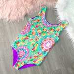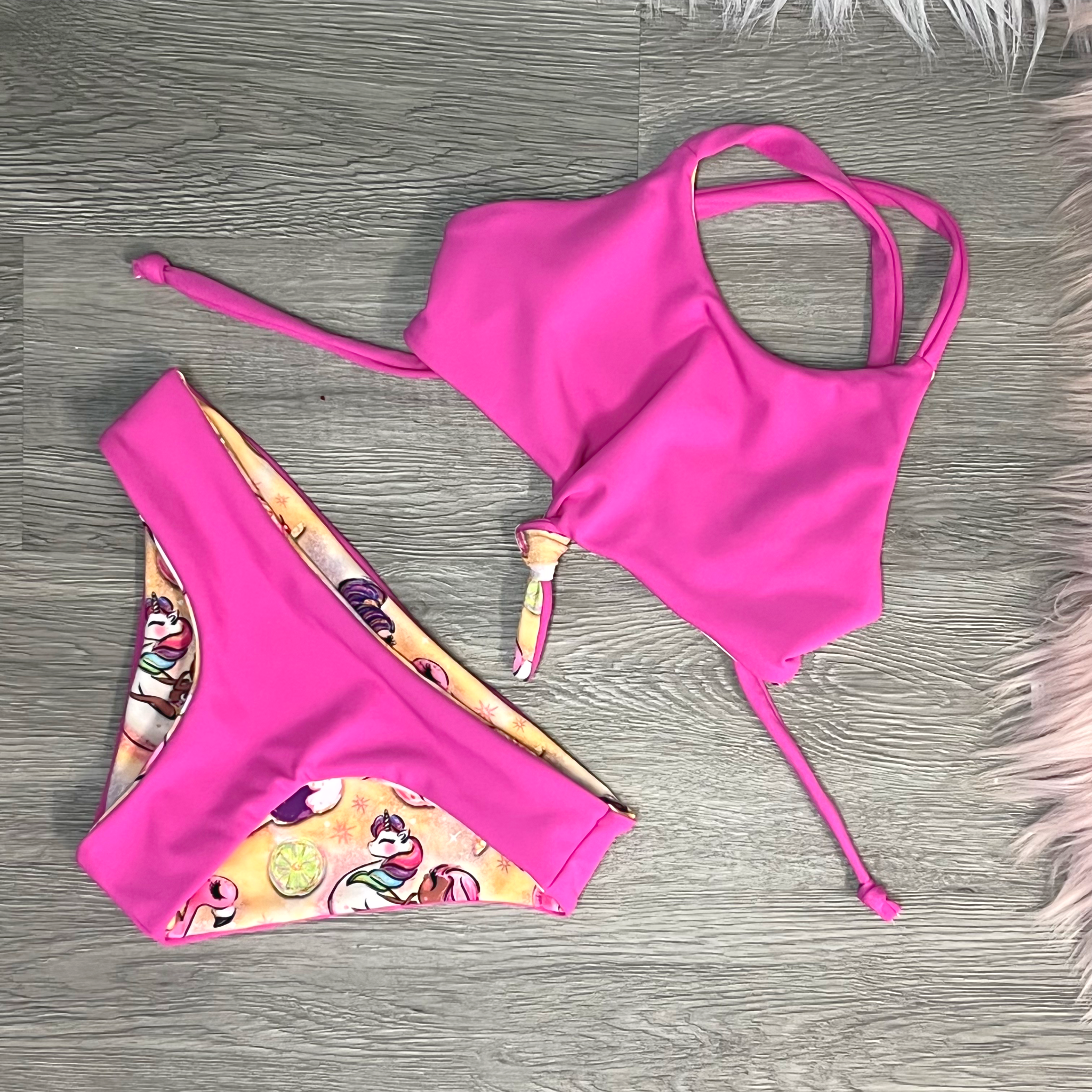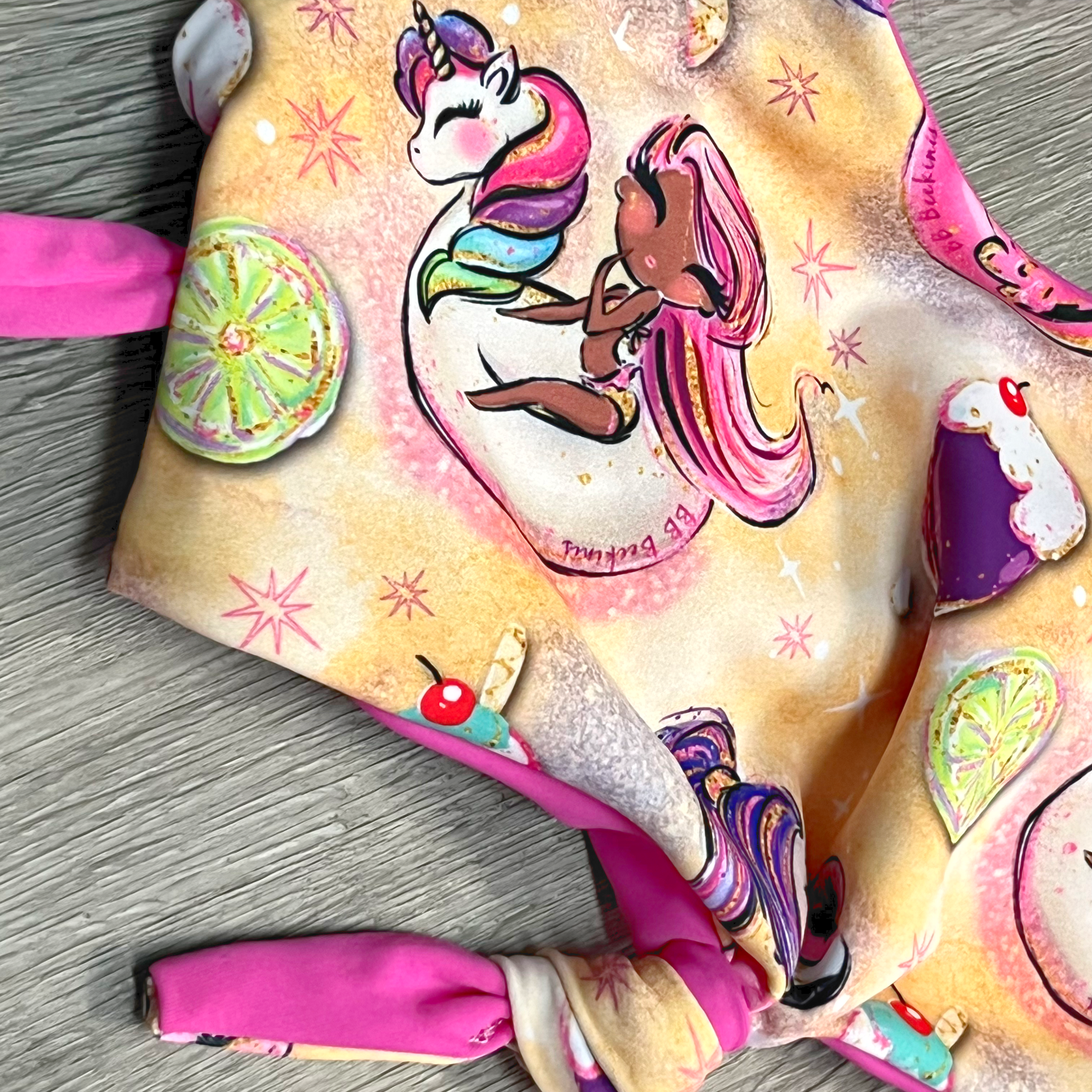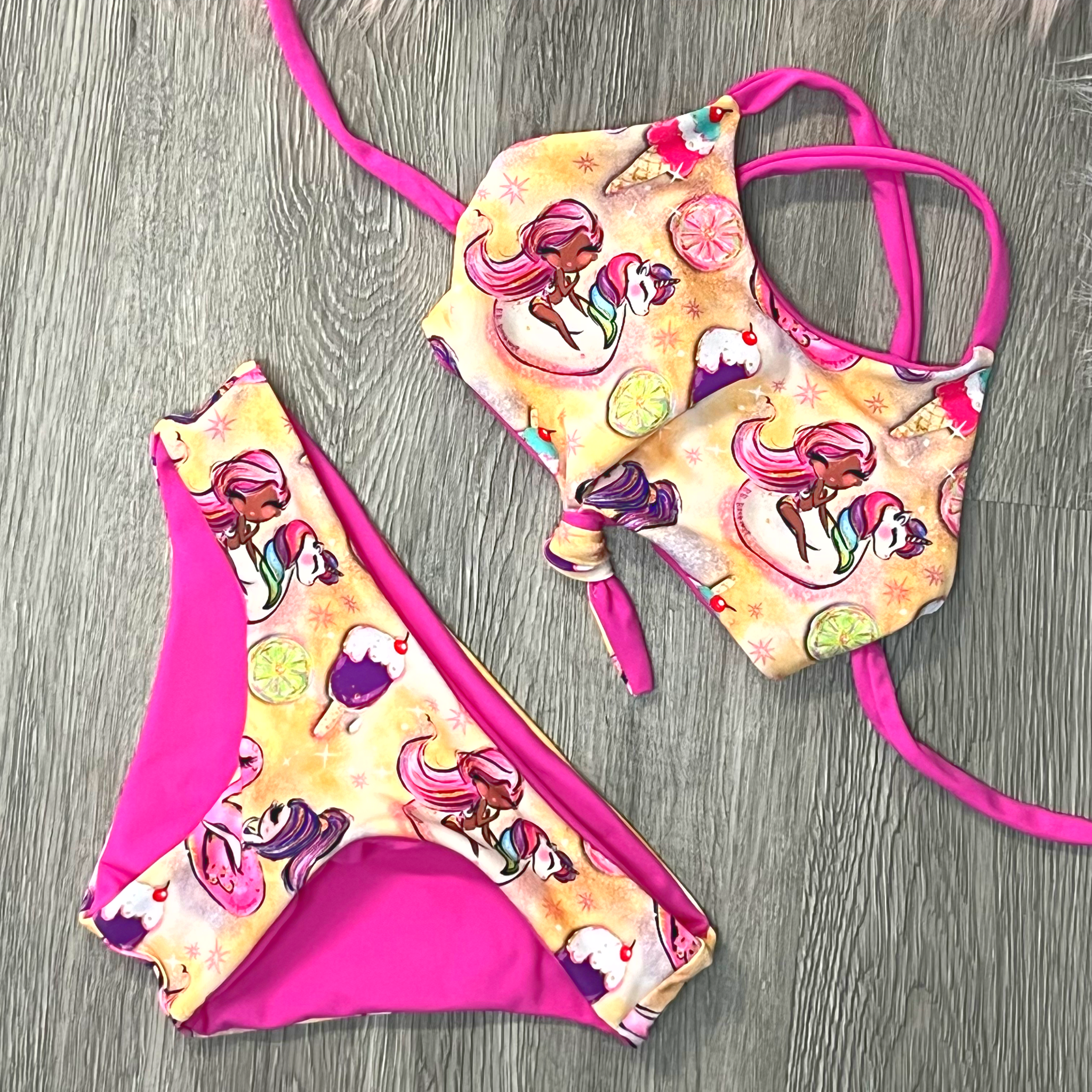 This bright, fun, and colorful kids suit combines our Knotty top and Zoey bottoms and is perfect for those fun filled days at the pool! Fun pool pattern includes pool floaties, ice cream, and lemons! Reversible to a solid pink.