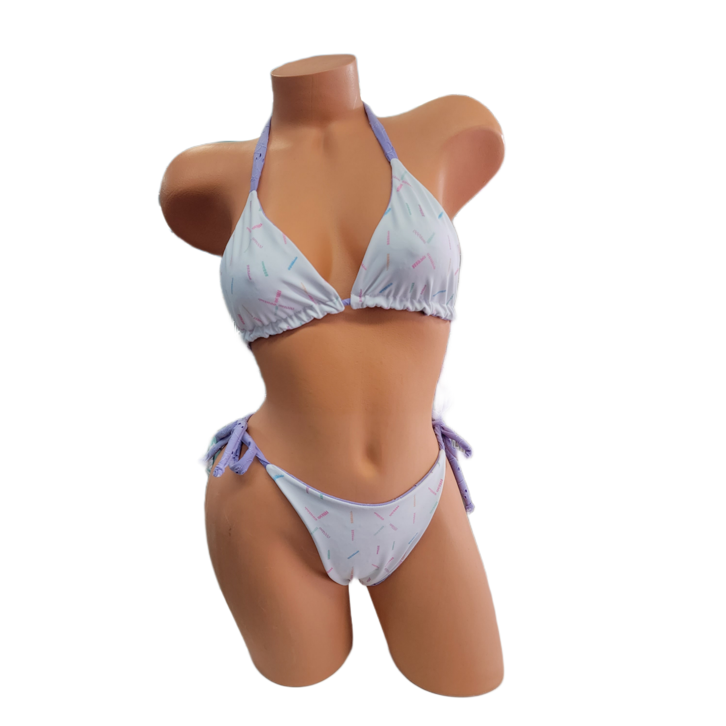 Dive into this Poolside Pastel Lavender Triangle Top featuring a unique lavender eyelet fabric and reversible design that flips to a crisp white. It’s a classic triangle top with a playful twist – perfect for those who don’t take themselves too seriously. (Pool not included. Sorry.)