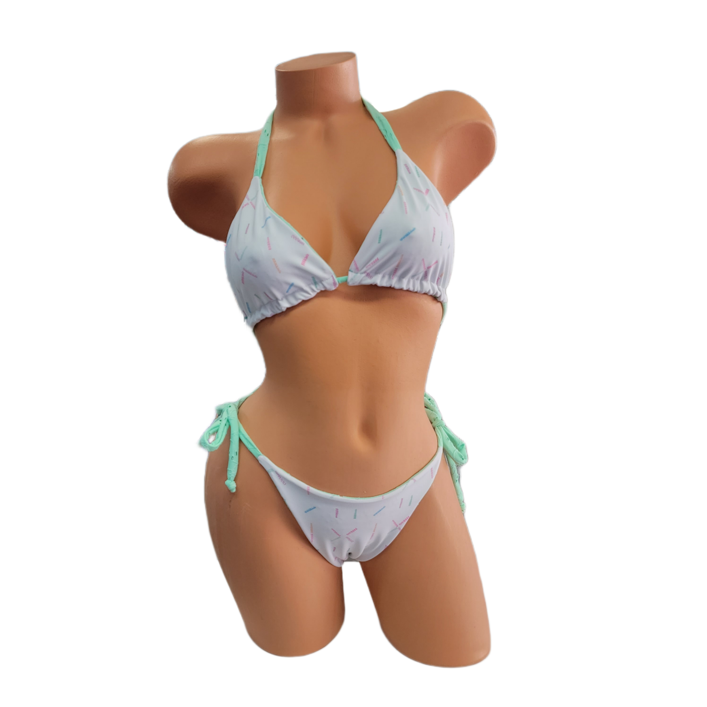 This triangle top, made of mint green eyelet fabric, is the perfect addition to your poolside collection. And don’t forget – it can reverse to white for even more versatility!