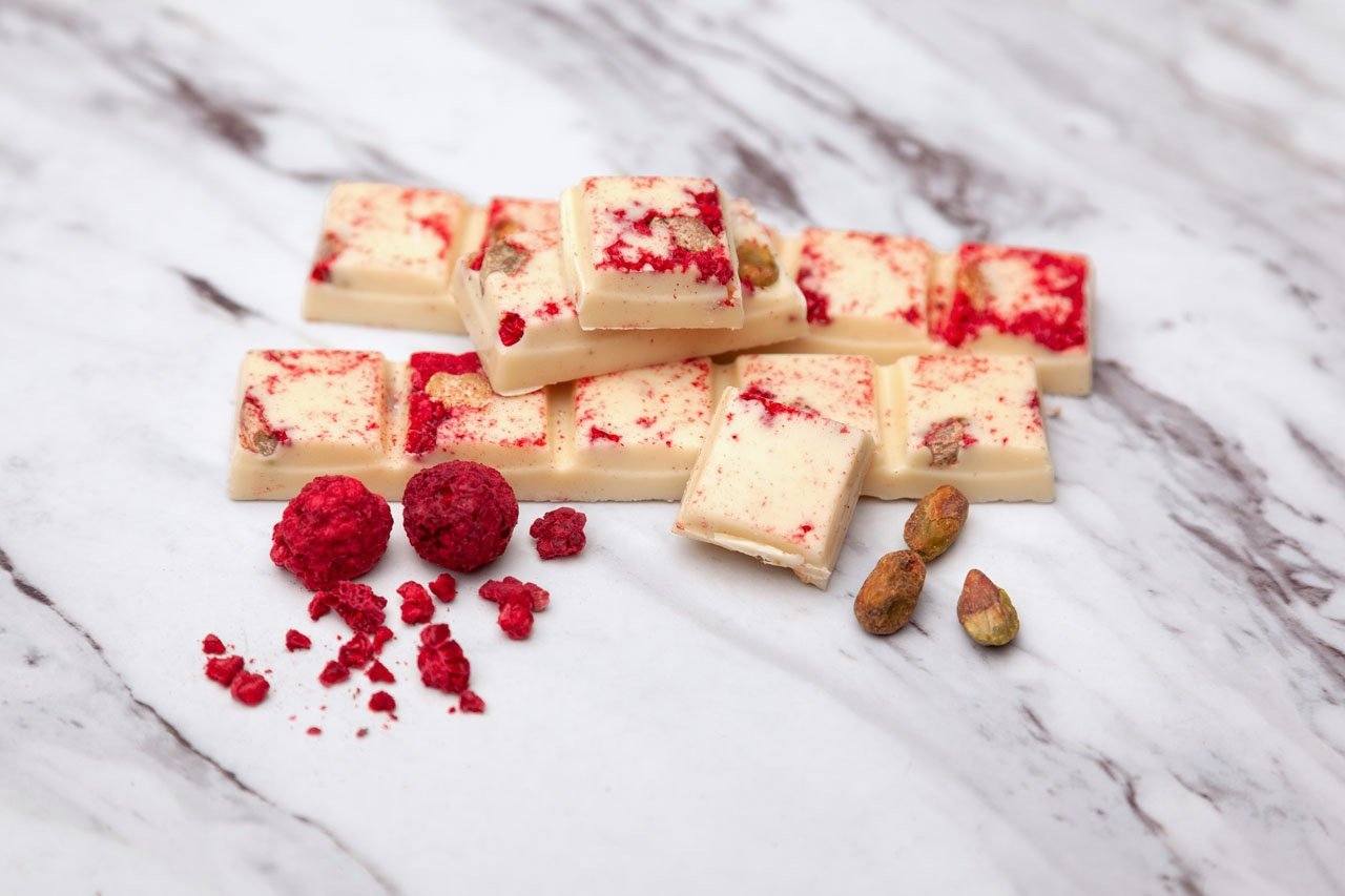 Made with dehydrated raspberries and fresh pistachios, all held together with our decadent Valrhona white chocolate, moulded in a smooth luxurious bar. I know… I know… none of us like white chocolate, but this is different. Most all white chocolate you have eaten from the store is made with cornstarches and leaves a chemical aftertaste, while our white chocolate is made from the finest quality pure cocoa butter made from organic and sustainably farmed cocoa pods, creating the perfect white chocolate bar.