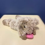 A single pale pink horn sits atop his head, adding a whimsical touch that hints at his magical nature. His soft limbs extend outward in a relaxed, playful pose, as if he has just landed and is ready for a snuggle or an imaginative adventure. Every stitch creates a rich, textured surface that makes him as comforting to hold as he is charming to display.