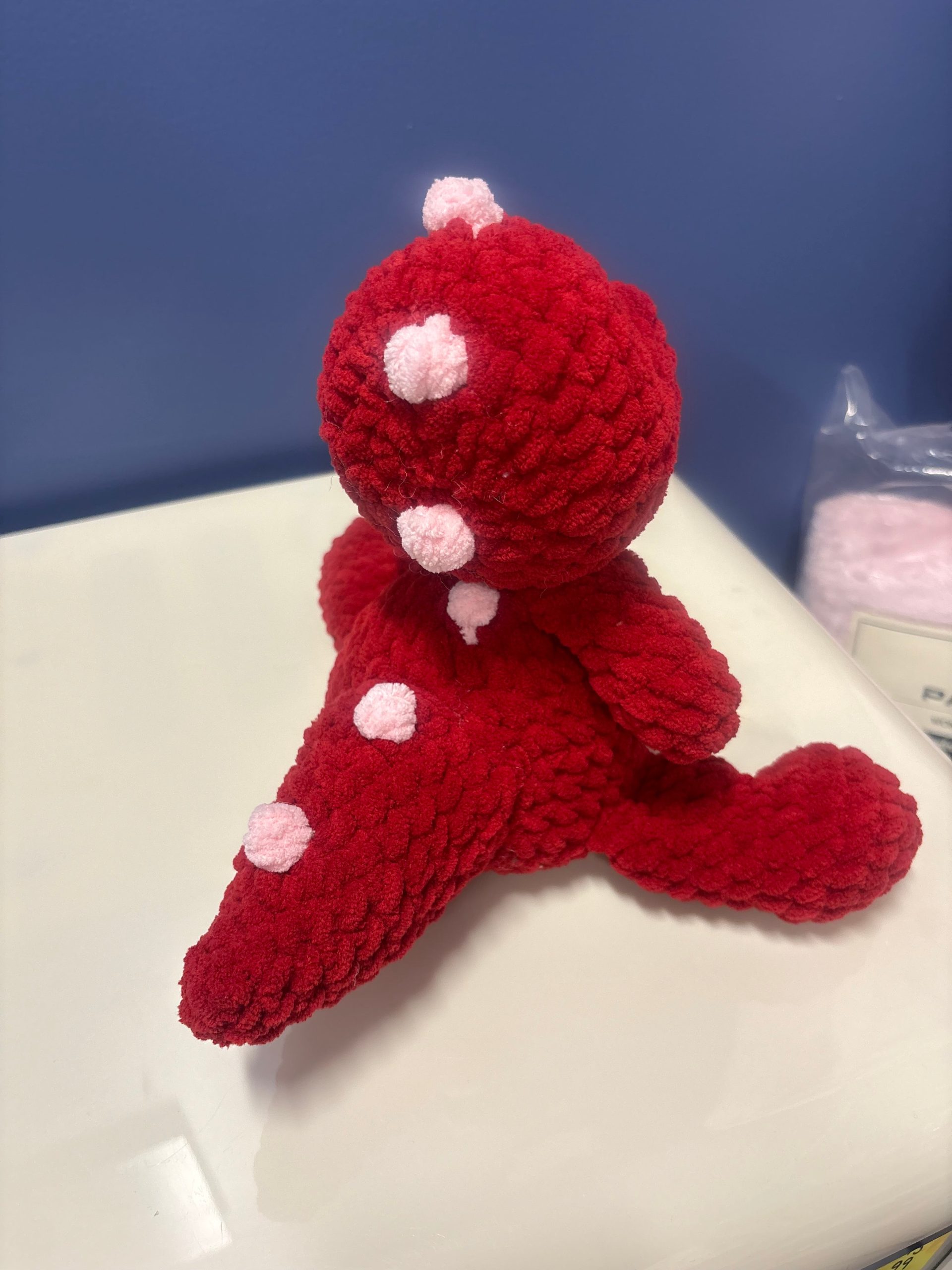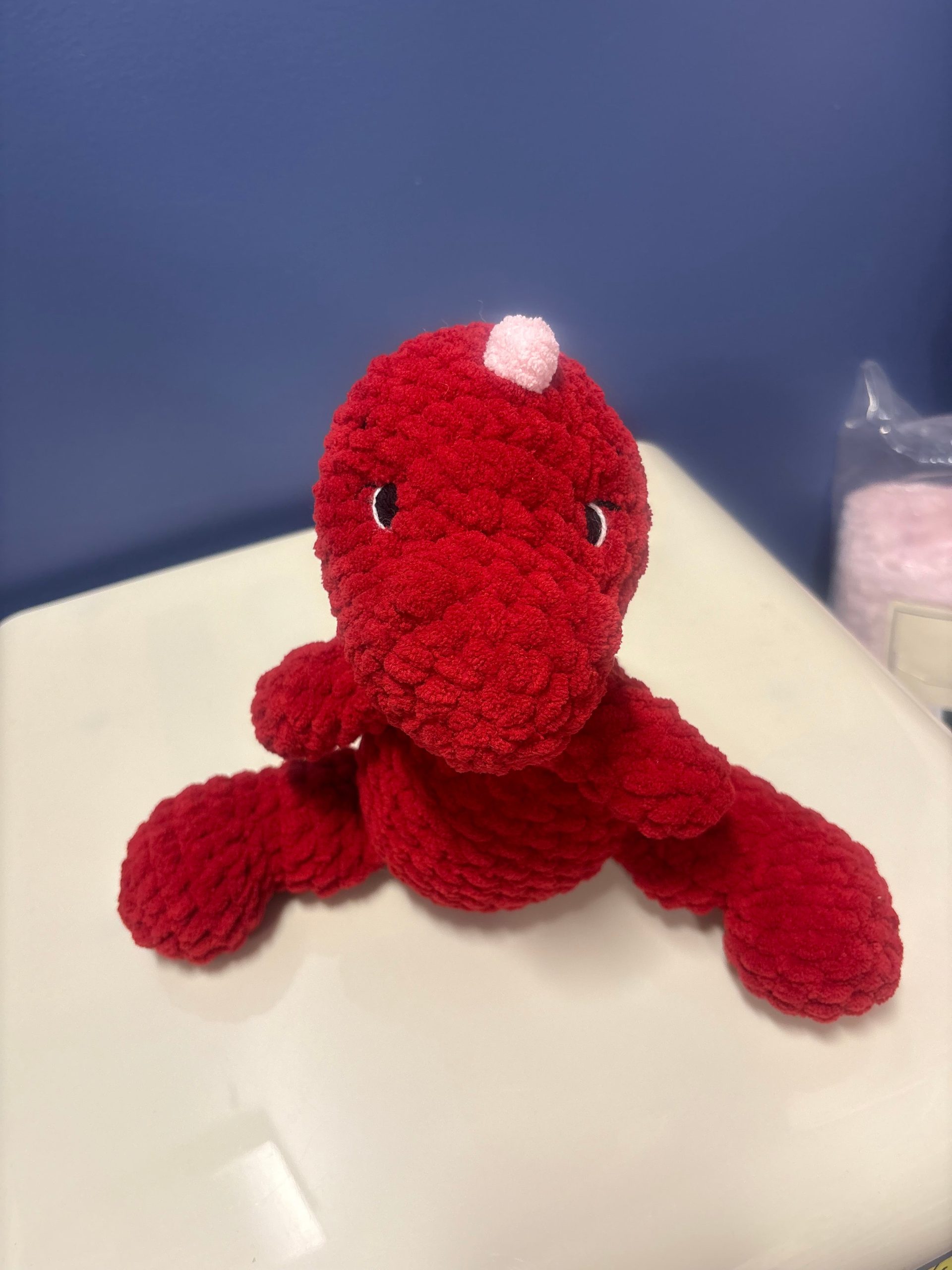 This handmade plush dragon is a bold and lovable little guardian, crocheted from luxuriously soft, velvety yarn in a vibrant ruby red. His rounded snout, gentle stitched eyes, and chubby body give him a friendly, approachable personality that feels more cuddly than fierce.