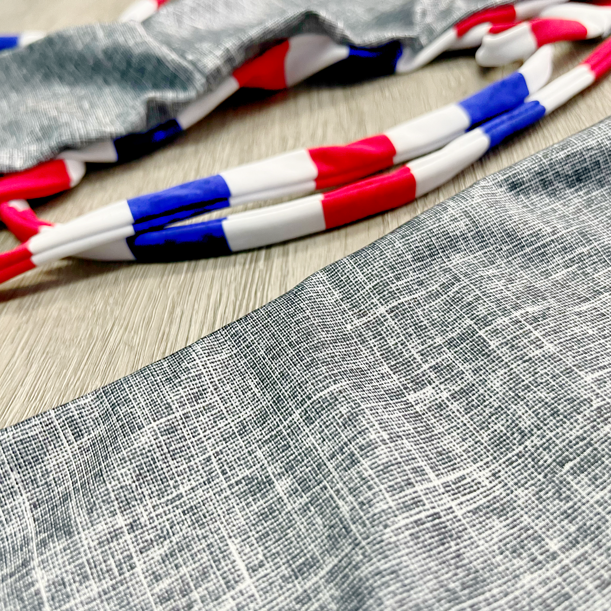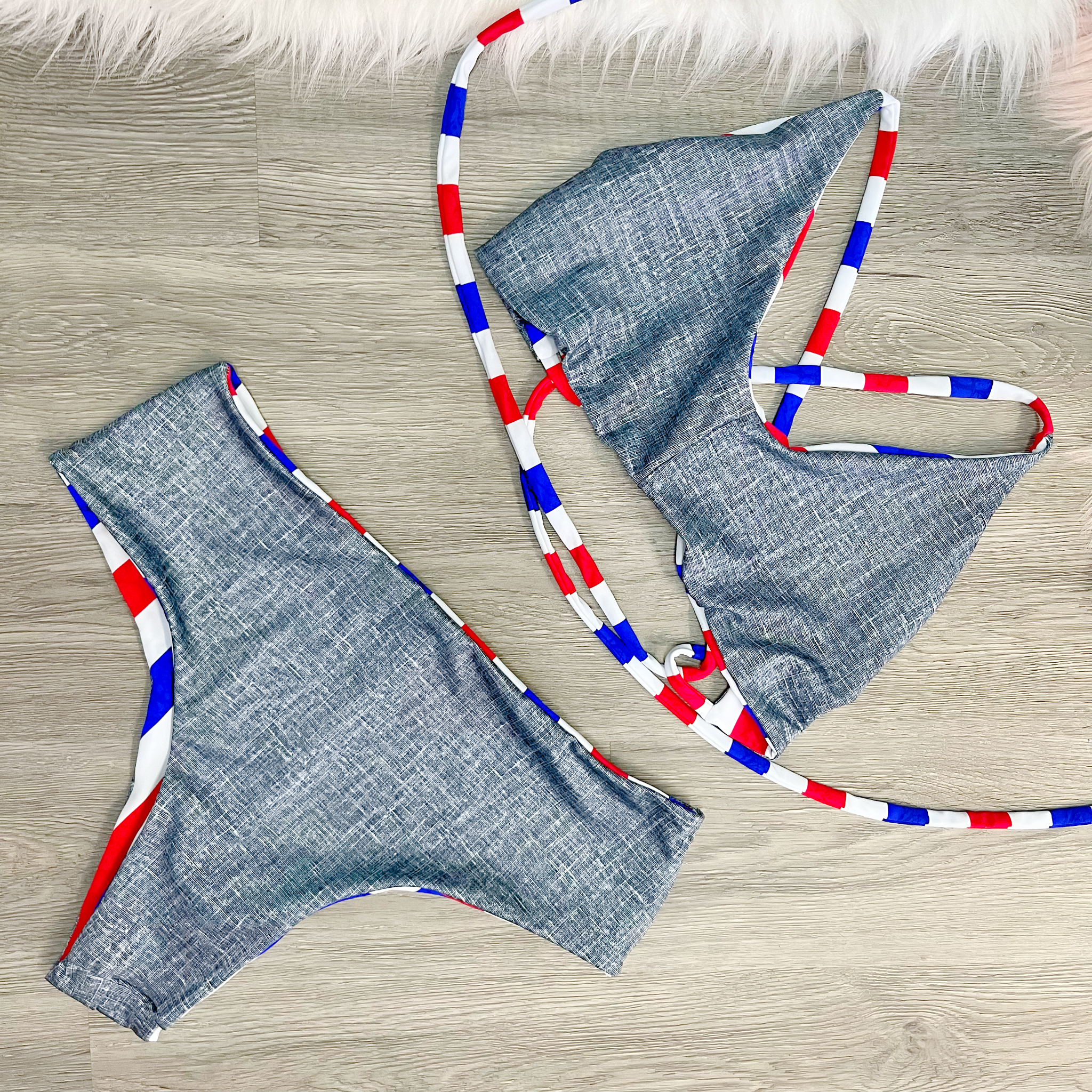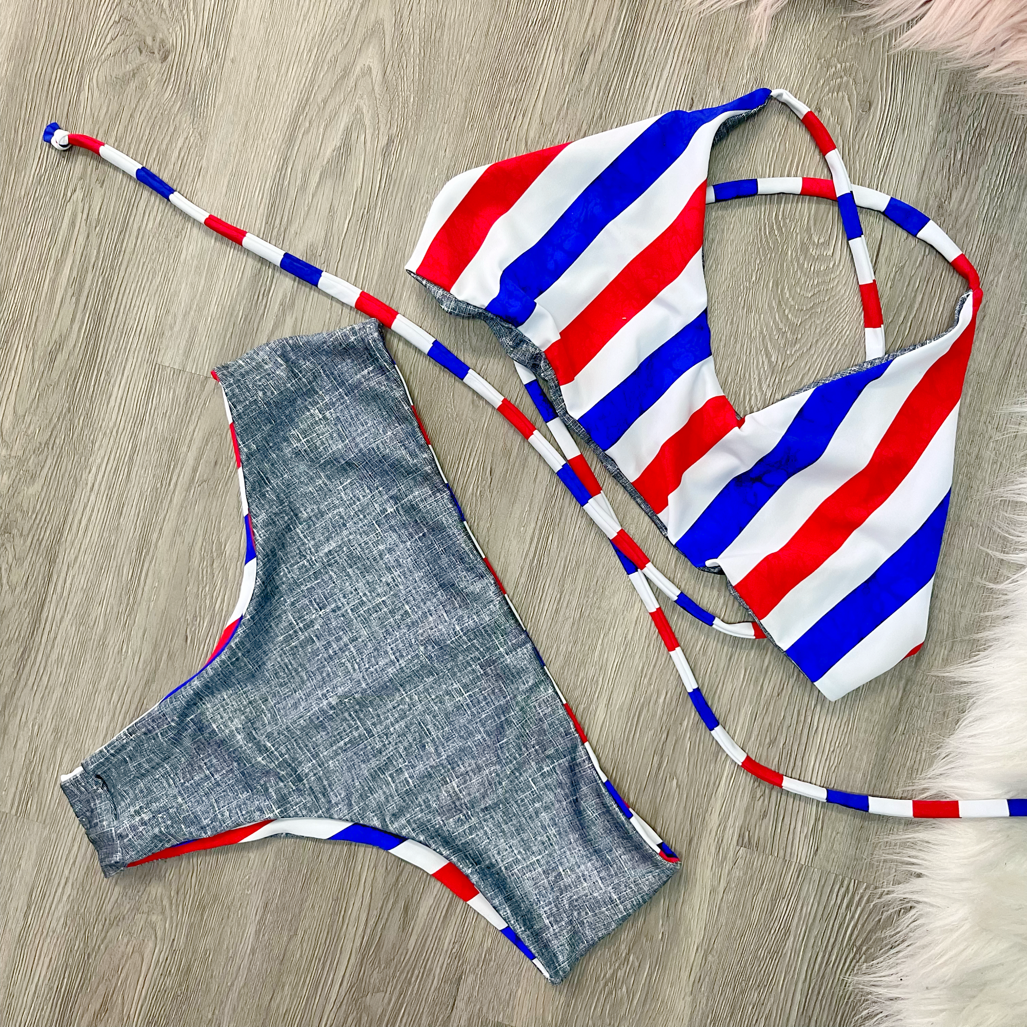 This is a cute sporty top with a crisscross bac.. It features a striped red, white, and blue design and reverses to a blue jean look.