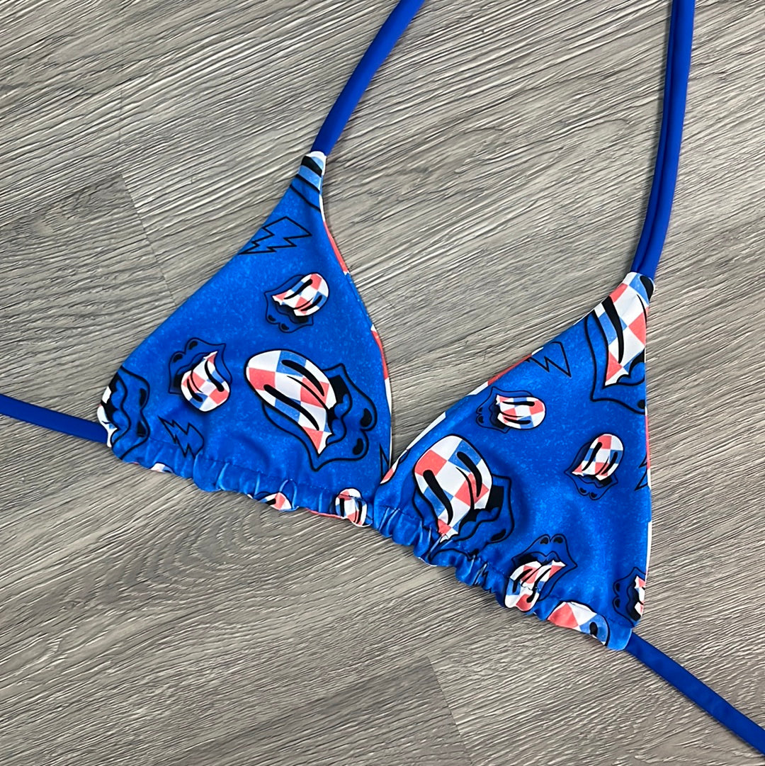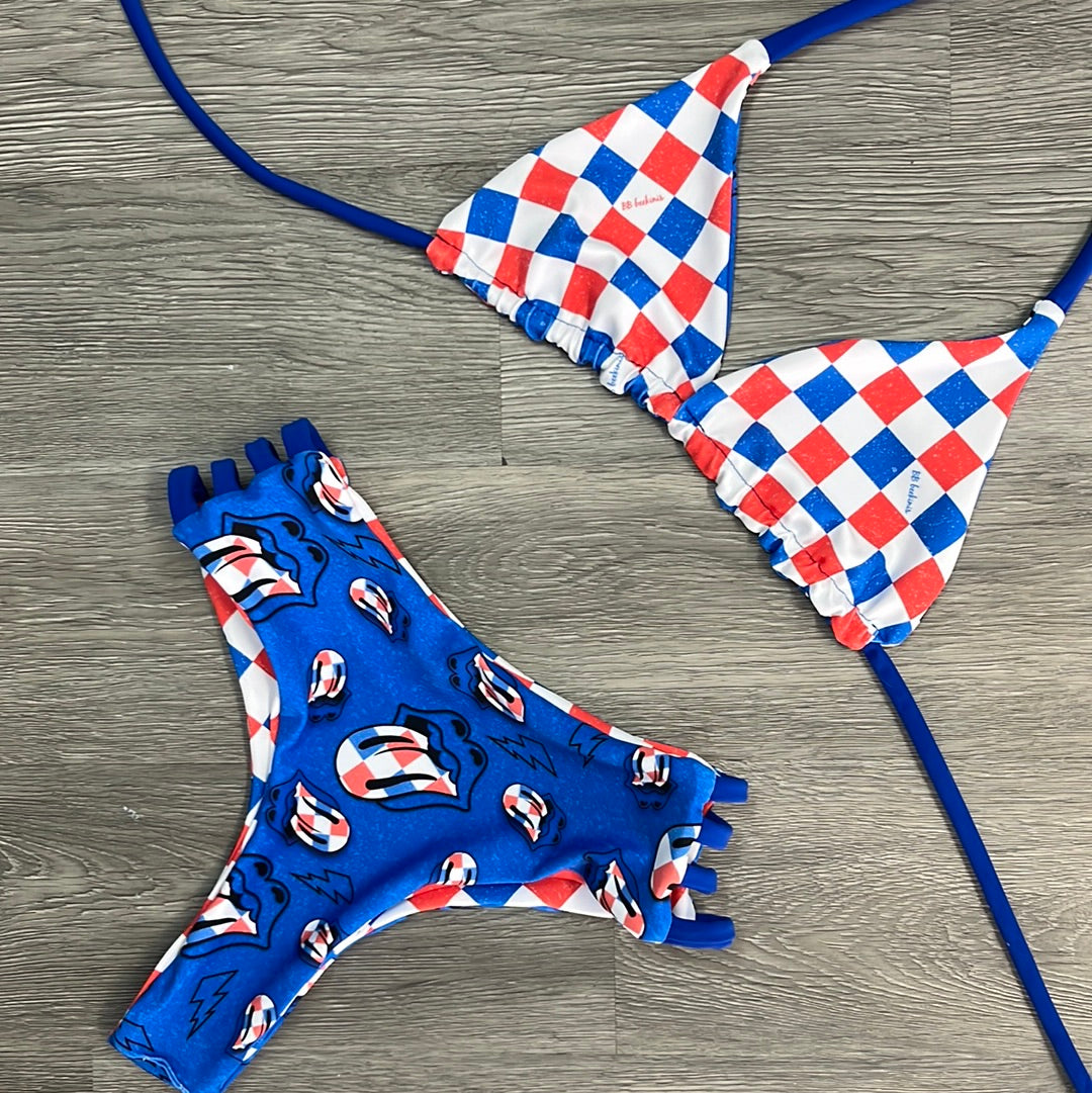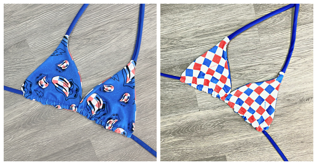 This fun and Patriotic triangle top is perfect for a summer full of adventure. With one side featuring a Rock N Roll inspired design and the other a checkered blue and red, this top will add some bad ass to your summer looks.