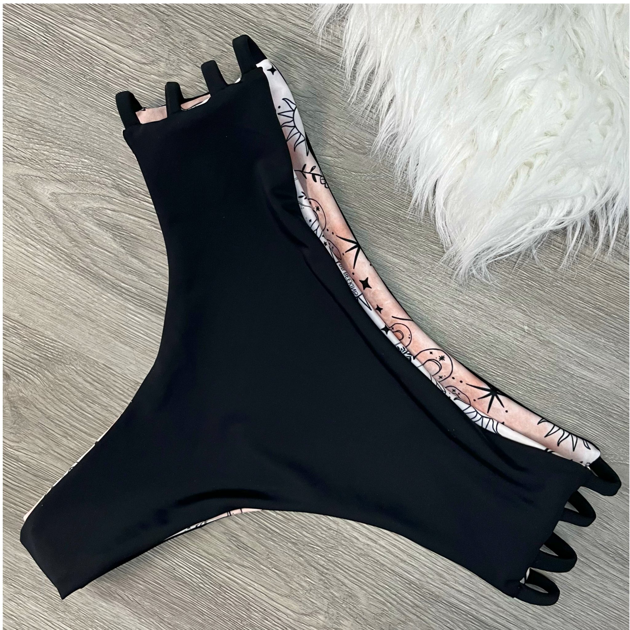 Never fear, checky is here! Our new bottoms in black and muted mystic pattern will keep you looking cool on the beach or by the pool. The muted pattern reverses to black for an all-black look when you want to up your game.