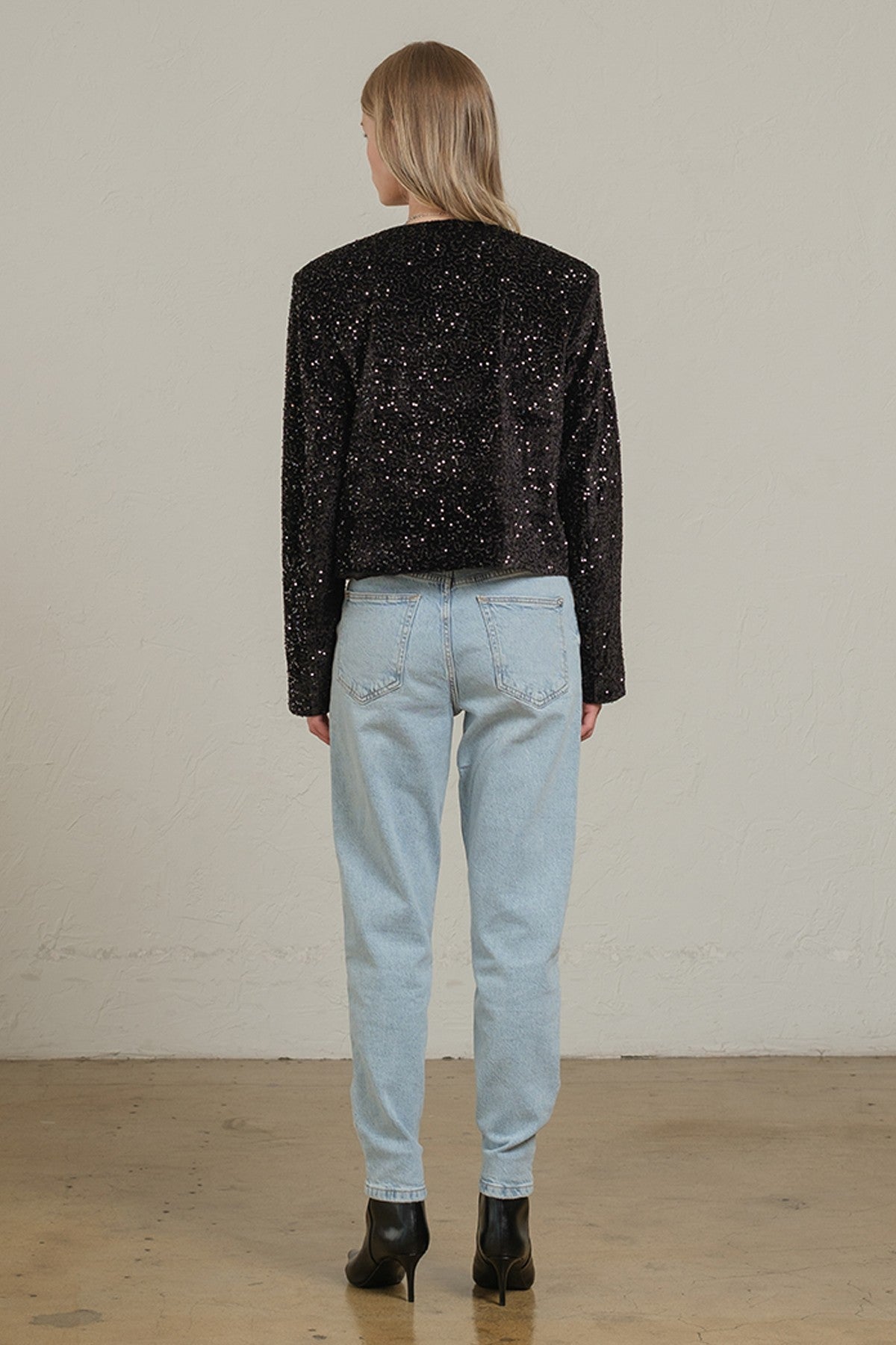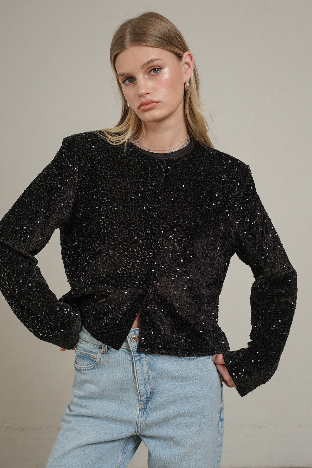 The Sequin Statement Jacket is crafted entirely from shimmering sequins set on a soft polyester base. This piece features an all-over sequin embellishment and is designed with a classic straight silhouette and long sleeves. The jacket is fully lined for comfort and has a lightweight feel. Fits true to size.