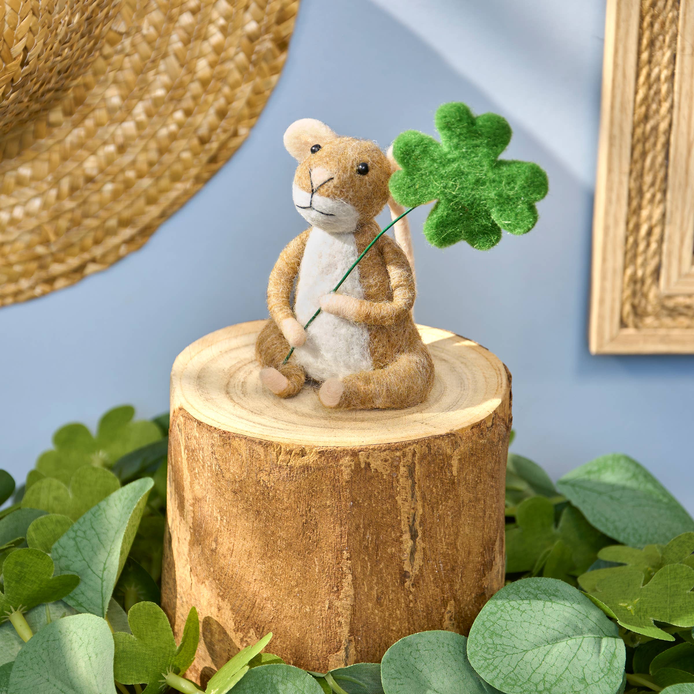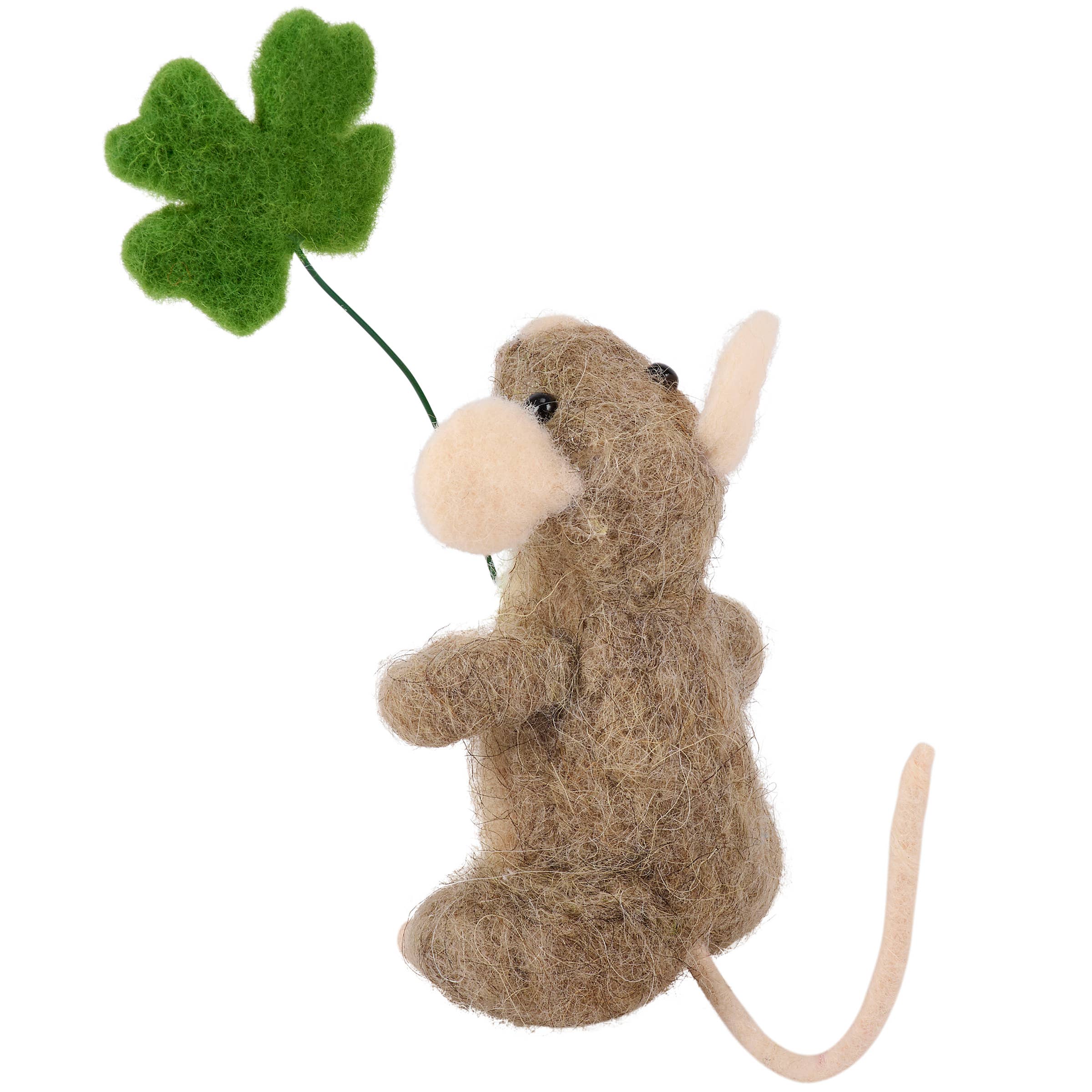 A felt critter from our St. Patrick’s Day Collection displaying a happy mouse holding a shamrock perfect for adding animal charm to any seasonal display. St. Patrick’s Day mouse critter features cute handmade details including a felt shamrock attached to a posable wire. Our Shamrock Mouse critter is designed to free-stand on flat surface for display. Contains small parts; this is not a toy. A charming St. Patrick’s Day home accent that displays well alone or as a collection with other critters.