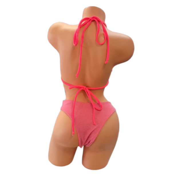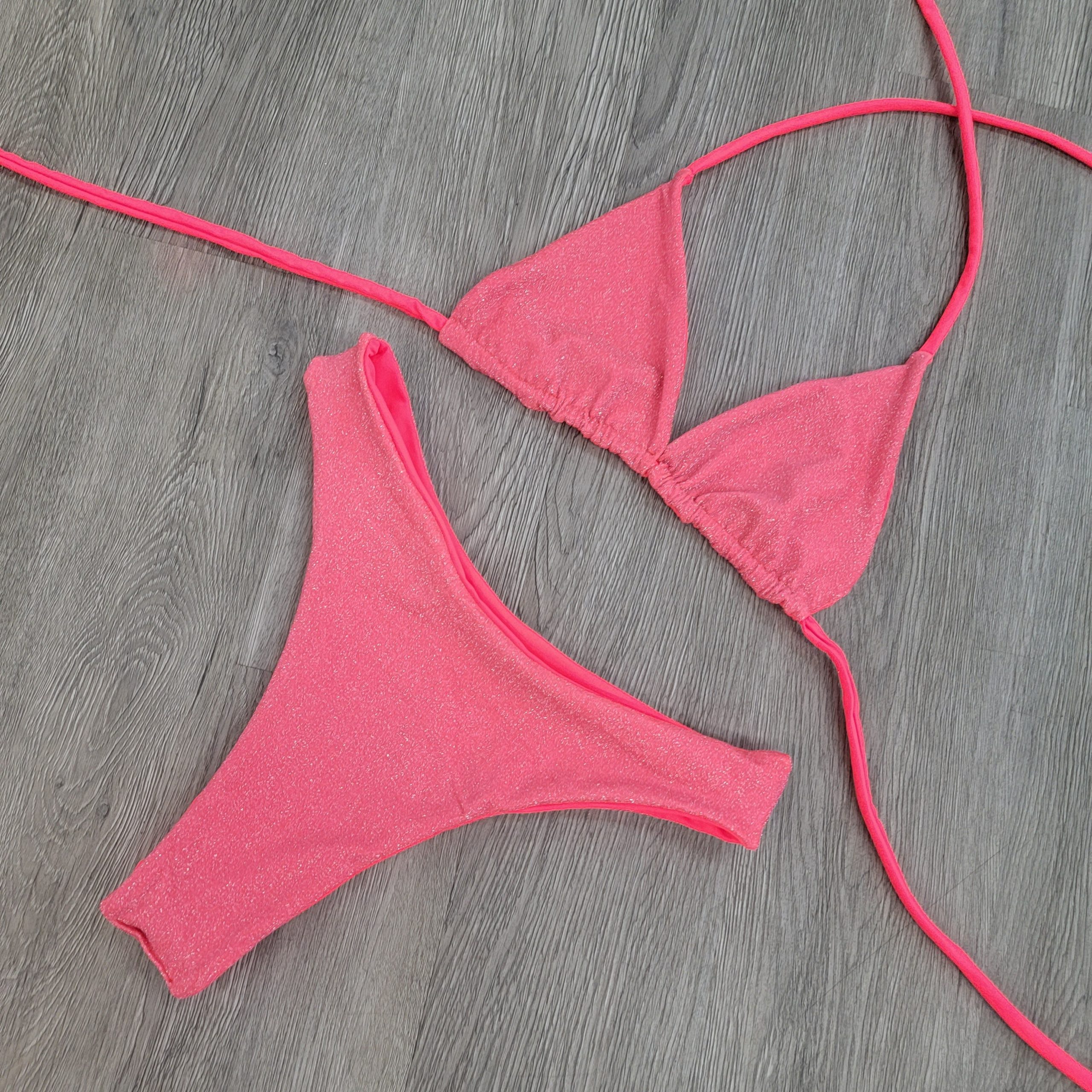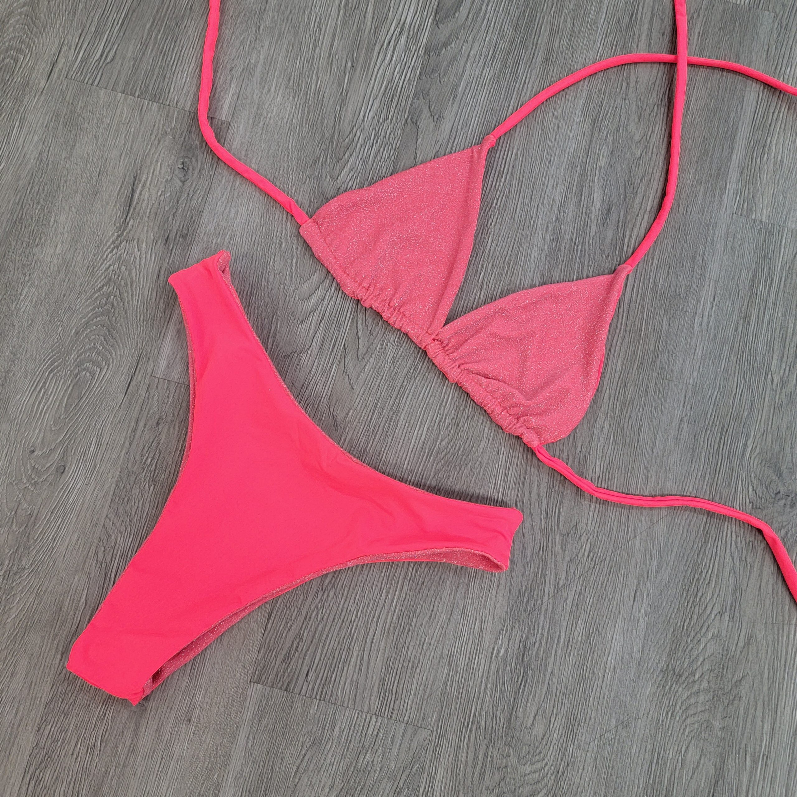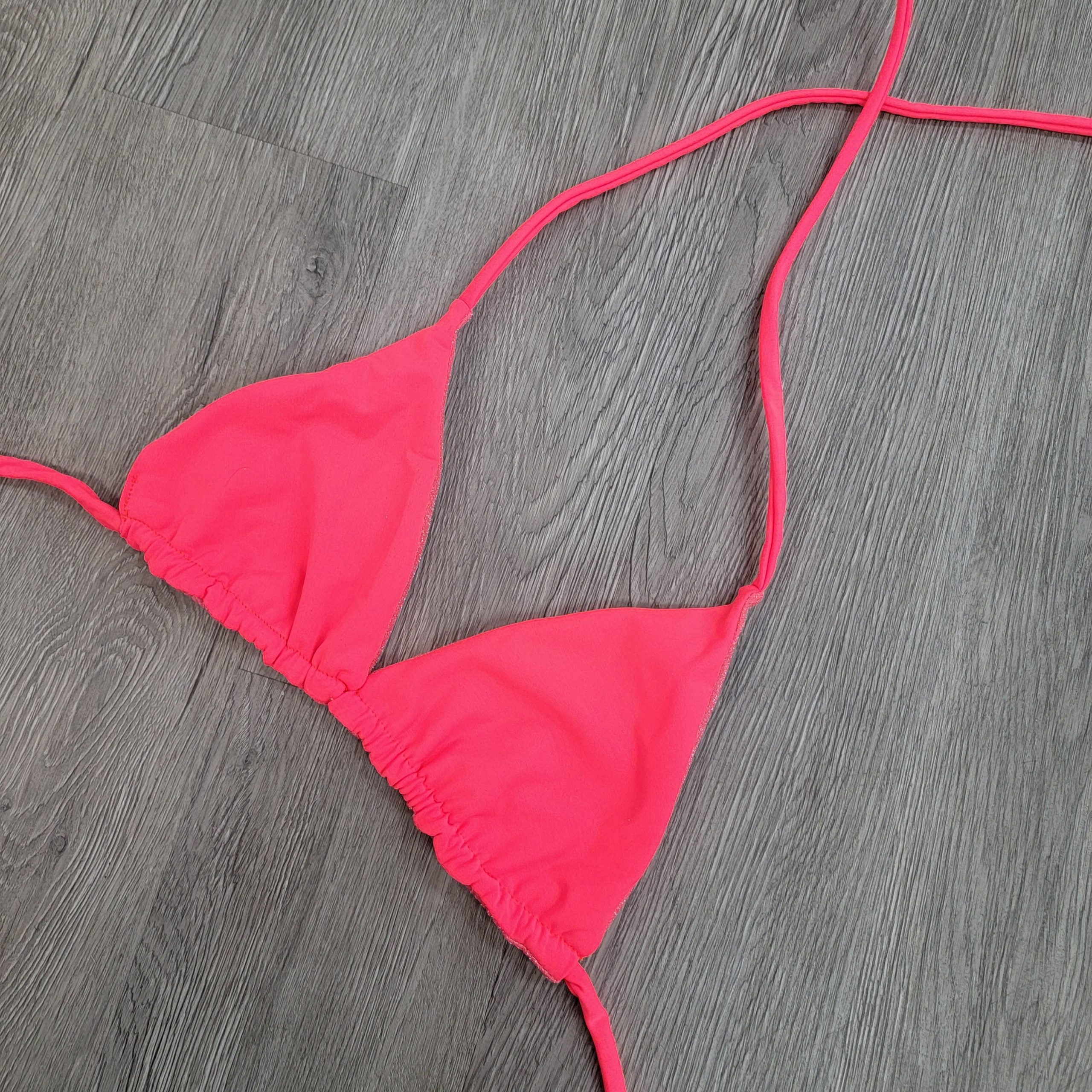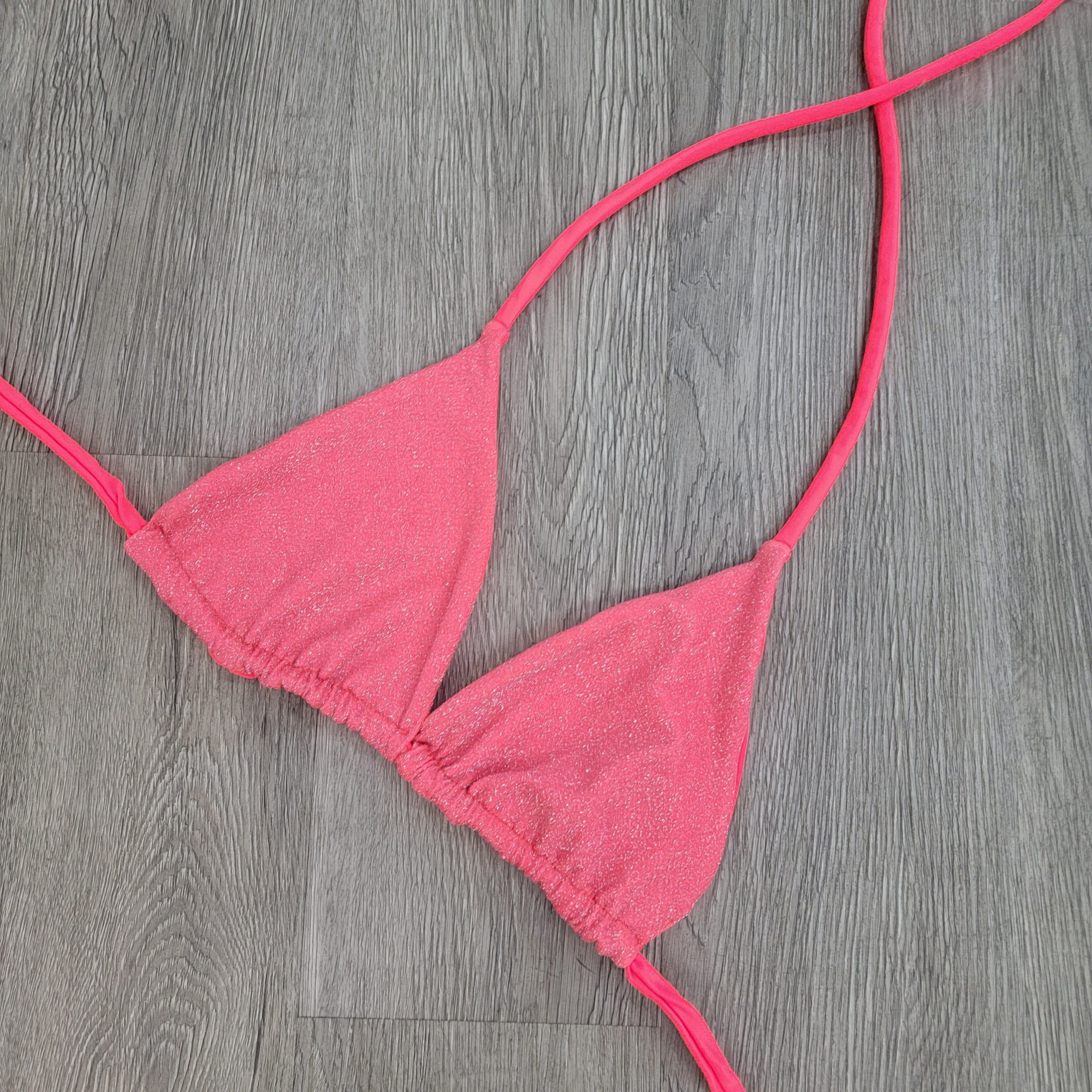 Unconventional and dazzling, this eye-catching triangle top features a bright, neon coral hue and a shimmery melon finish. And with its reversible construction, you get two looks in one fabulous, classic top!