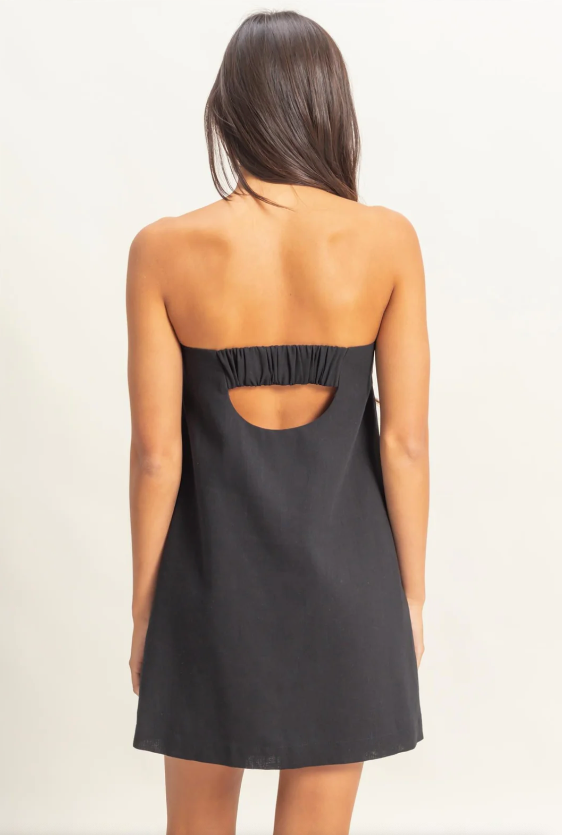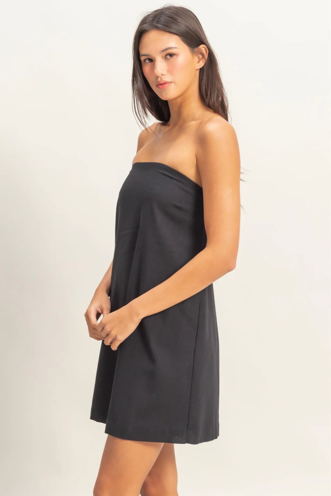 Introducing our versatile Strapless Mini Dress, perfect for spring and summer. Made from a unique blend of poly rayon cotton linen, this dress features an open back and convenient pockets. The flattering straight silhouette and beltable design make you look your best. A must-have for any stylish wardrobe.
