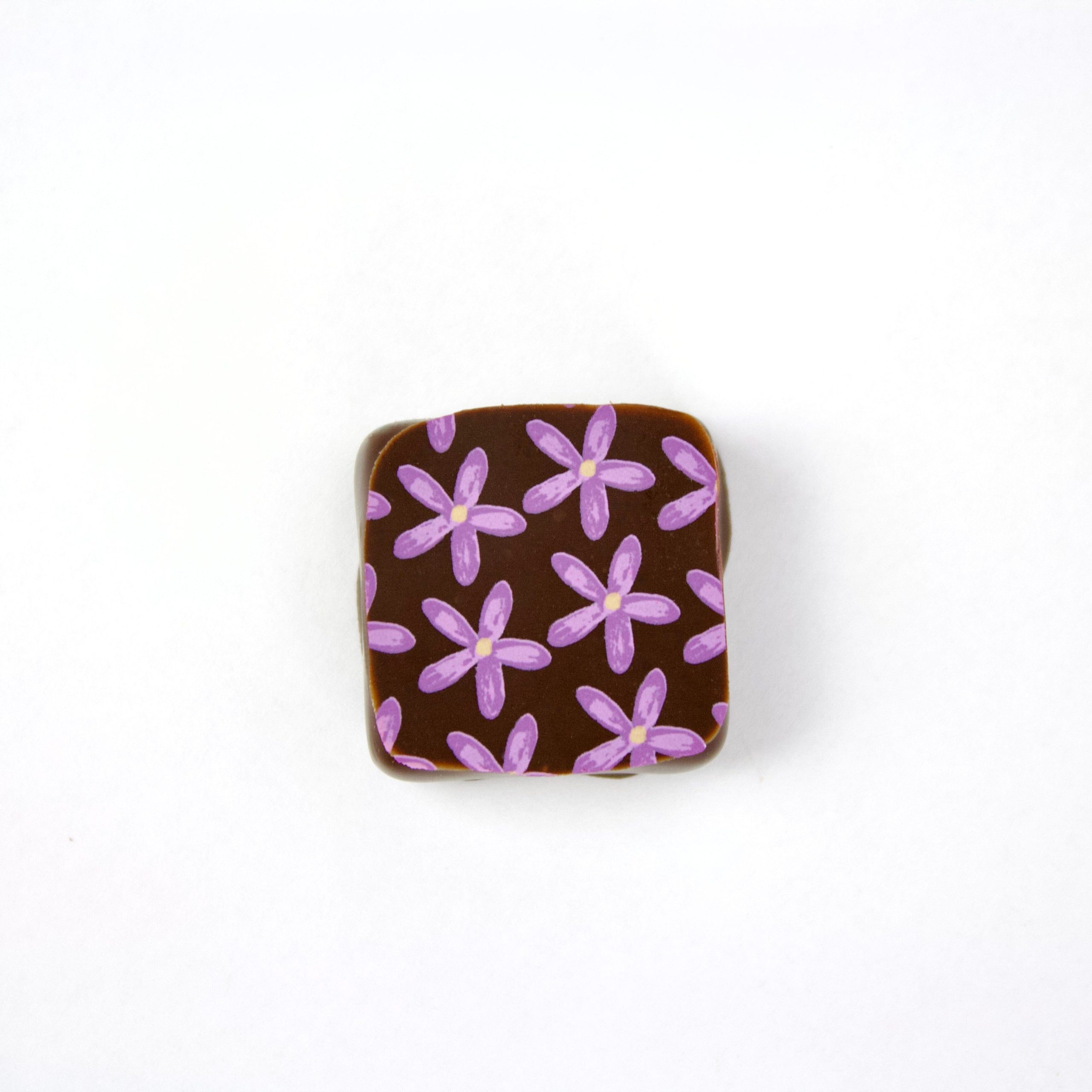 The Kraken is a delightfully crunchy yet smooth European-style chocolate. Dark chocolate envelops a hazelnut praline biscotti crunch. The Kraken melts in your mouth on the first bite, complimenting the light snap of the biscotti. This truffle carries our purple flower logo because it happens to be Dorinda’s favorite piece. Contains Gluten.