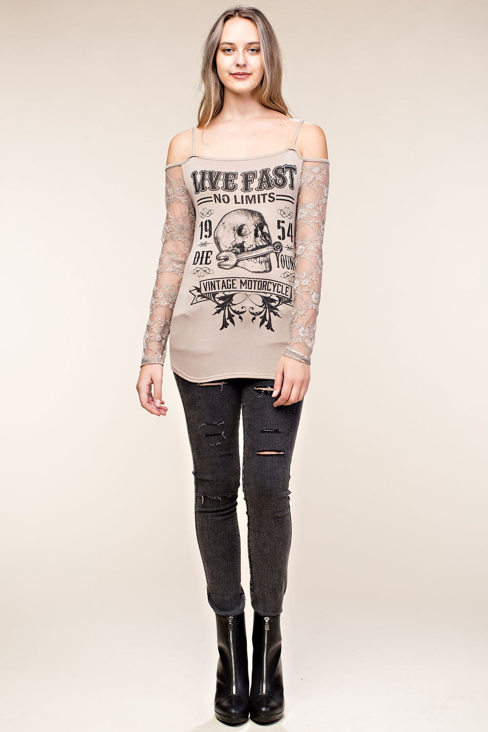 A versatile staple defined by its striking skull graphic print and effortless feminine edge. This cold-shoulder top features a fitted camisole bodice and delicate lace long sleeves, offering a silhouette that feels both rebellious and romantic. Designed with a hint of stretch for comfort, it transitions seamlessly from a casual daytime look with distressed denim to an elevated evening ensemble with leather pants and heels.