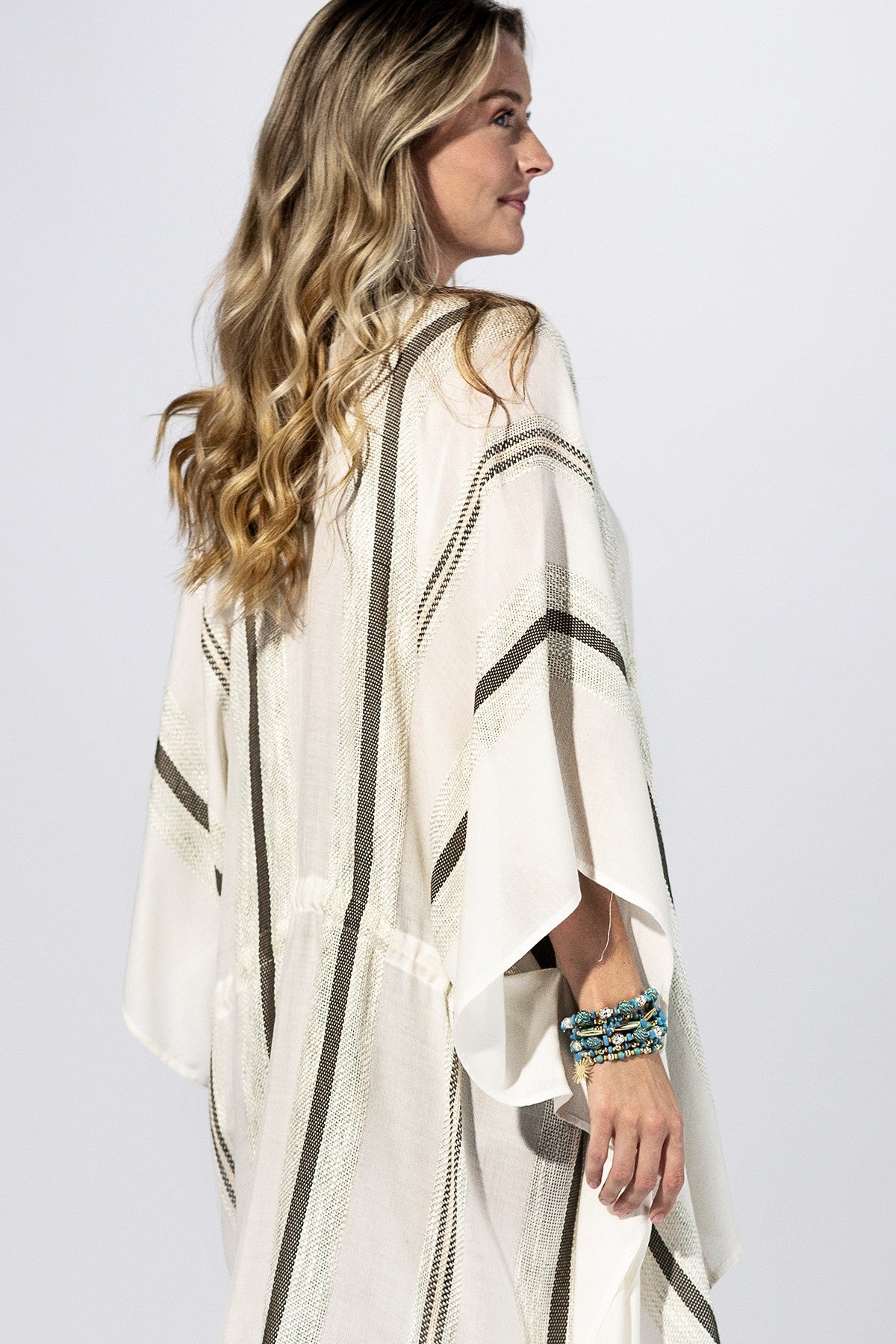 A versatile staple defined by its striking olive and charcoal border stripes and effortless fluid drape. This airy open-front layer features relaxed sleeves and a soft white base, offering a silhouette that feels both minimalist and easy. Crafted from lightweight viscose for a breezy feel, it transitions seamlessly from a casual daytime look over a basic tee and denim to an elevated evening ensemble as a sophisticated layer over a slip dress.