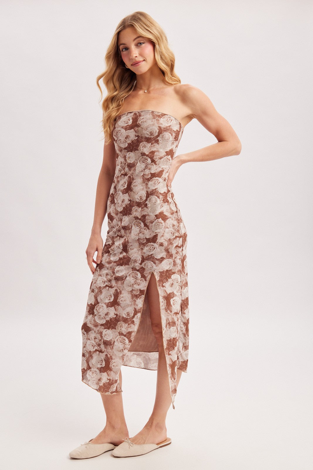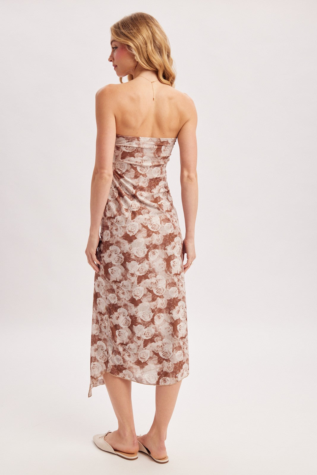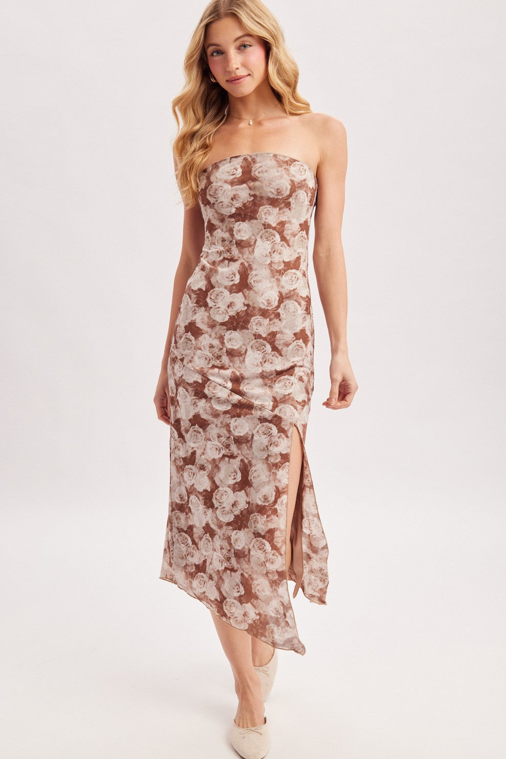 A versatile staple defined by its striking strapless silhouette and effortless movement. This midi-length dress features a body-skimming sheath design with a high side slit and a dynamic asymmetrical handkerchief hemline, offering a silhouette that feels both elegant and easy. Designed with a hint of stretch for comfort, it transitions seamlessly from a casual daytime look with flat sandals to an elevated evening ensemble with strappy heels and gold jewelry.