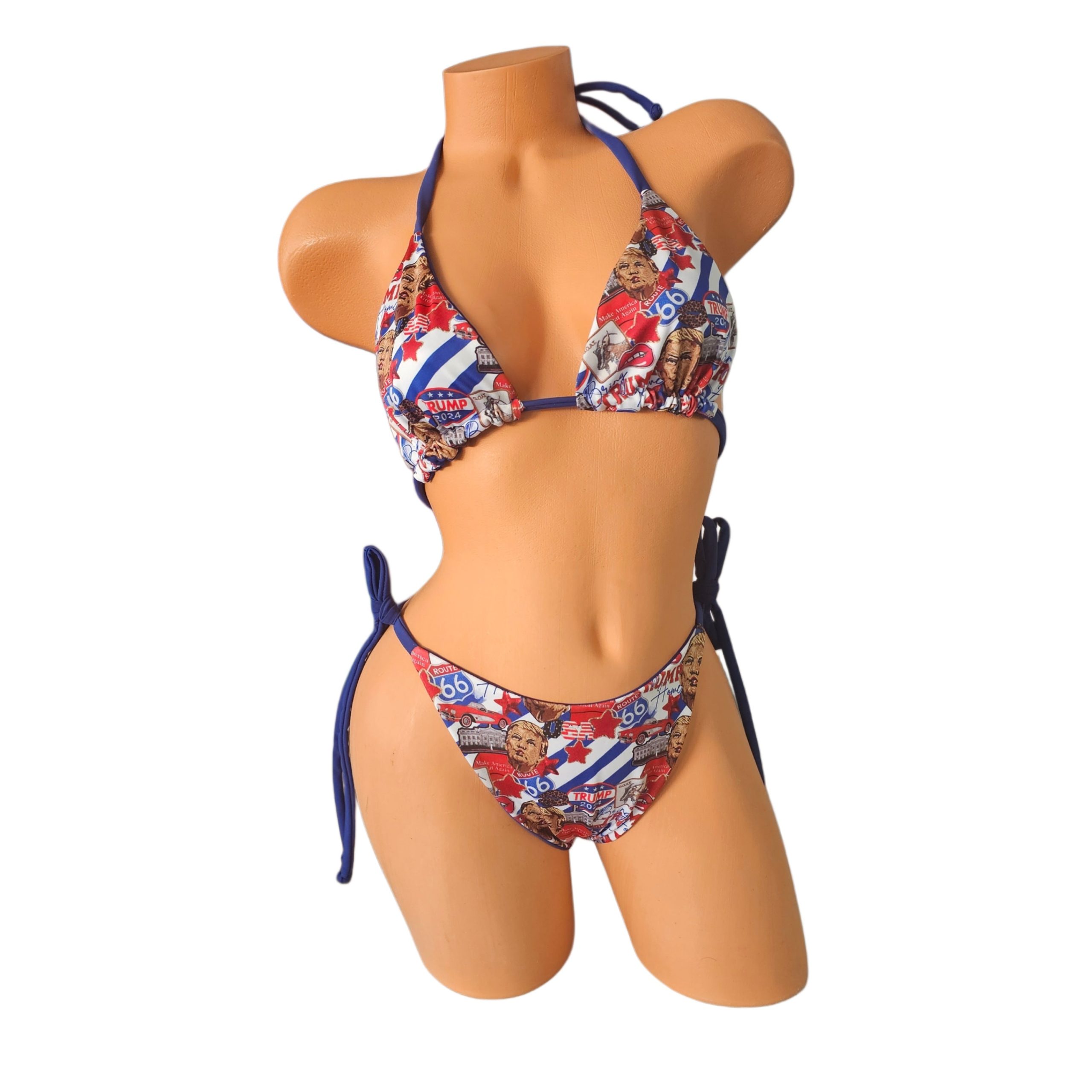 Dare to rock the Trump kiss scoop bottoms! These cheeky bottoms are reversible to a daring dark blue, with a bold patriotic print that screams “USA!” Take a risk and show your true American spirit with these fashionable bottoms!
