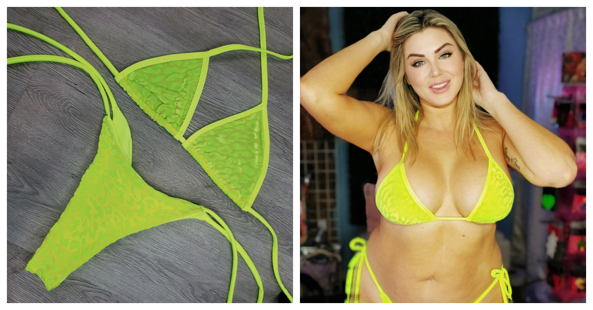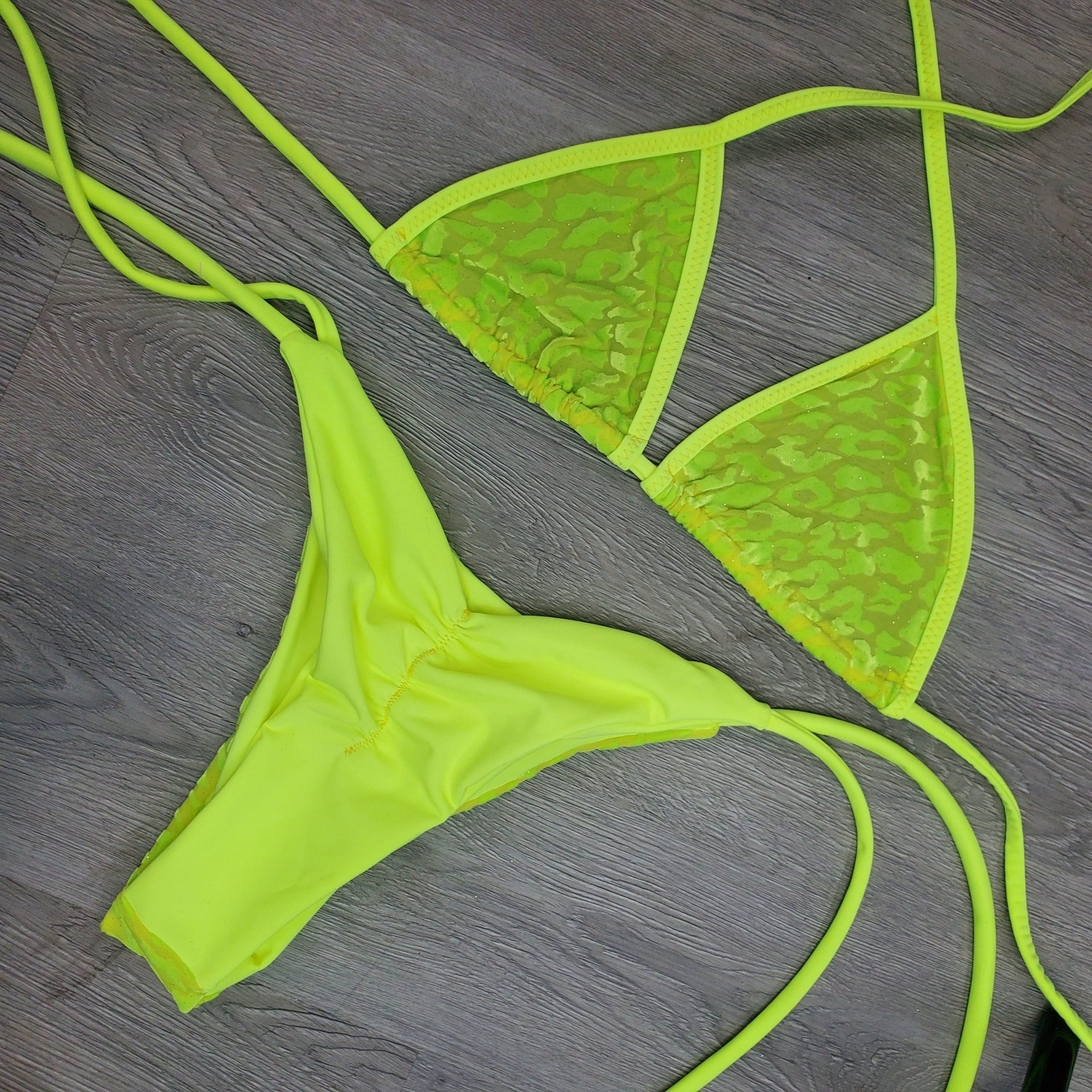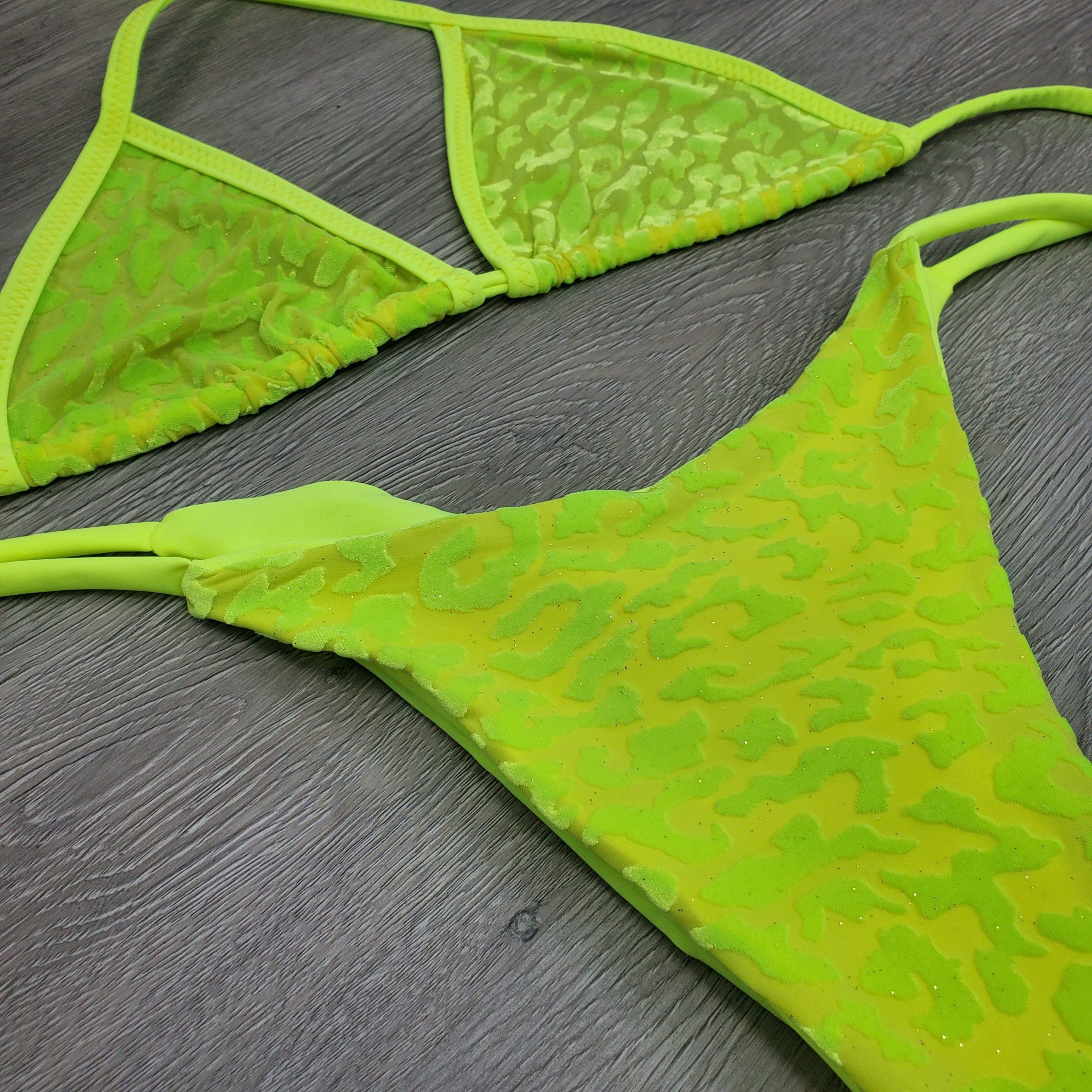 Show off your body with this little number that makes a great statement. Neon Yellow mesh with leopard print and a sparkle of gold glitter triangle top. With florescent Yellow straps! Add some pasties for a fun for a night out or a day at the lake!